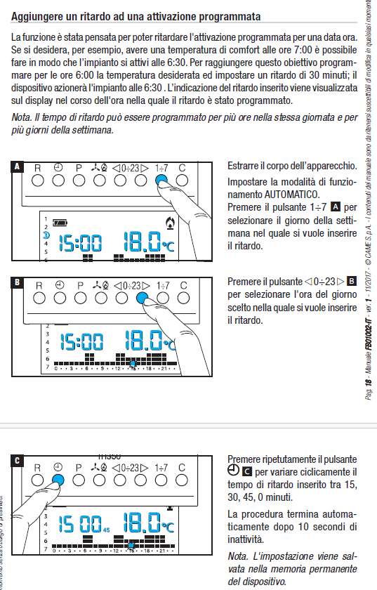 Non è un anticipo. Io programmo alle 7.00 inserendo il ritardo di accensione di 30 minuti, quindi deve partire alle 7.30 in realtà non vede il ritardo ma parte alle 7. Come vedi nell'esempio del manuale, è programmato alle 15.00 con un ritardo di 45 minuti ( la cifra in piccolo vicino a 00). Significa che si accenderà alle 15.45 invece delle 15.00 Nel mio caso il ritado non viene letto al momento dell'avvio, e non capisco il perchè. -