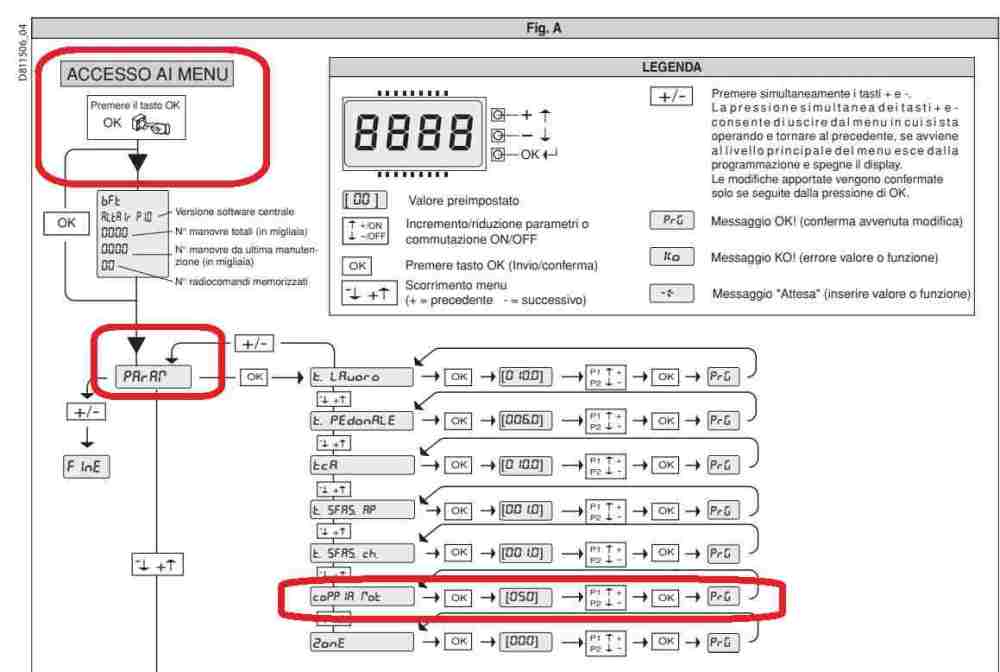 C'è da dire che quelle casse sono completamente marce dalla ruggine, non è che per caso i motori durante la corsa si muovono e si impuntano impedendone l'avanzamento? Riesci a postare un video in modo che si vada come lavorano i motori FROG-A? (Attenzione che devi caricarlo su un sito di supporto esterno tipo YouTube, Google Drive o altro e poi caricare qui il link del video stesso) Un altra prova che si può fare, è quella di testare un motore alla volta direttamente alla tensione di rete senza passare per la centrale utilizzando un pulsante doppio (tipo quelli per le tende / tapparelle) e vedere come lavora, intendo così: Entra in programmazione e verifica il parametro "Coppia motori" in quale percentuale è impostata, vedi qui: E quindi se necessario aumentare un po' la forza e poi riprovare -