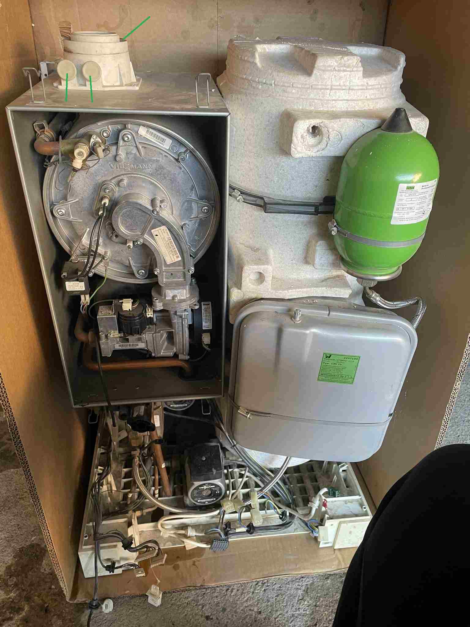 Sulla caldaia ho (vedi foto) l'aspirazione da 100mm. Posso, o togliere la guarnizione attualmente istallata e metterci li il tubo da 100 e collegarmi all'altro che sale al camino, o si possono sfruttare i due fori sull'aspirazione che al momento sono tappati ? Ci posso mettere due tubetti li e infilarli nel tubo che va al tetto ? Perchè io pensavo di staccare il tubo fumi da 60 per il pezzo orrizontale , metterci quello da 100 e raccordarlo al tubo che va al tetto, e ovviamente rimettere il tubo da 60 per lo scarico fumi. E' un po' complicato ma niente che mi spaventi. Nel contempo, ma attendo vostro parere , potrei anche sostituire le curve dello scarico fumi con due curve da 30/45° anziche quelle da 90° ma non so se siano corrette quelle da 90 o da 30/45. Grazie -