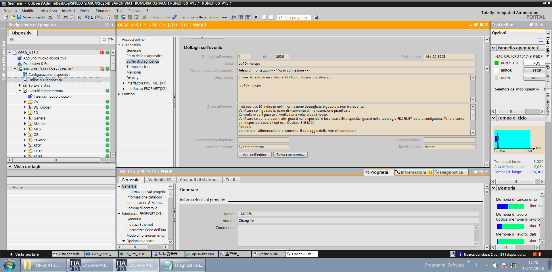 Salve, probabilmente a seguito di diversi black out successivi, due cpu comunicanti tramite device con GSD fornito dal fornitore esterno,hanno smesso di comunicare con l'cona classica nodo non accessibile. Se uso la diagnostica delle due CPU e faccio assegna nome al dispositivo,mi compare il nodo a cui sono collegato OK e il nodo dell'altra CPU da assegnare e quanto provo ad assegnarlo mi da il seguente messaggio di errore: Non è stato possibile assegnare il nome del dispositivo profinet tal dei tali all'indirizzo mac(della porta di collegamento profinet).E' già assegnato ad un altro dispositivo(che chiaramente non c'è,usando anche proneta ne trovo uno) Se mi sposto sull'altra CPU mi da il suo nome ok ma l'altro dell'altra cpu da assegnare identico giro di messaggi. Tramite le porte pingo entrambe le due CPU,come porte di comunicazione credo funzionino.Il gsd creato dal fornitore chiaramente non fa fede ad un dispositivo fisico esistente ma è un device virtuale diciamo di comunicazione. Chiaramente ho controllato impostazioni di sicurezza,cavi connettori(tramite ping anche)progetti e HW e indirizzi non modificati ecc ecc. Anche il gsd del cliente è esattamente lo stesso,chiaramente. Persino gli orari sono stati portati esattamente allo stesso score per evitare problemi di sincronizzazione. Ma non riesco a trovare la quadra. Purtroppo. Se c'è qualche altra prova che posso fare,o ho ommesso qualcosa,resto in ascolto. La CPU 1 è una 1517 - 3PN-DP la CPU 2 è una 1515- 2PN il dp Normal device corrispondente 6ES7 515-2AM01-0AB0 corrispondente chiaramente alla CPU2 1515-PN. Grazie mille.