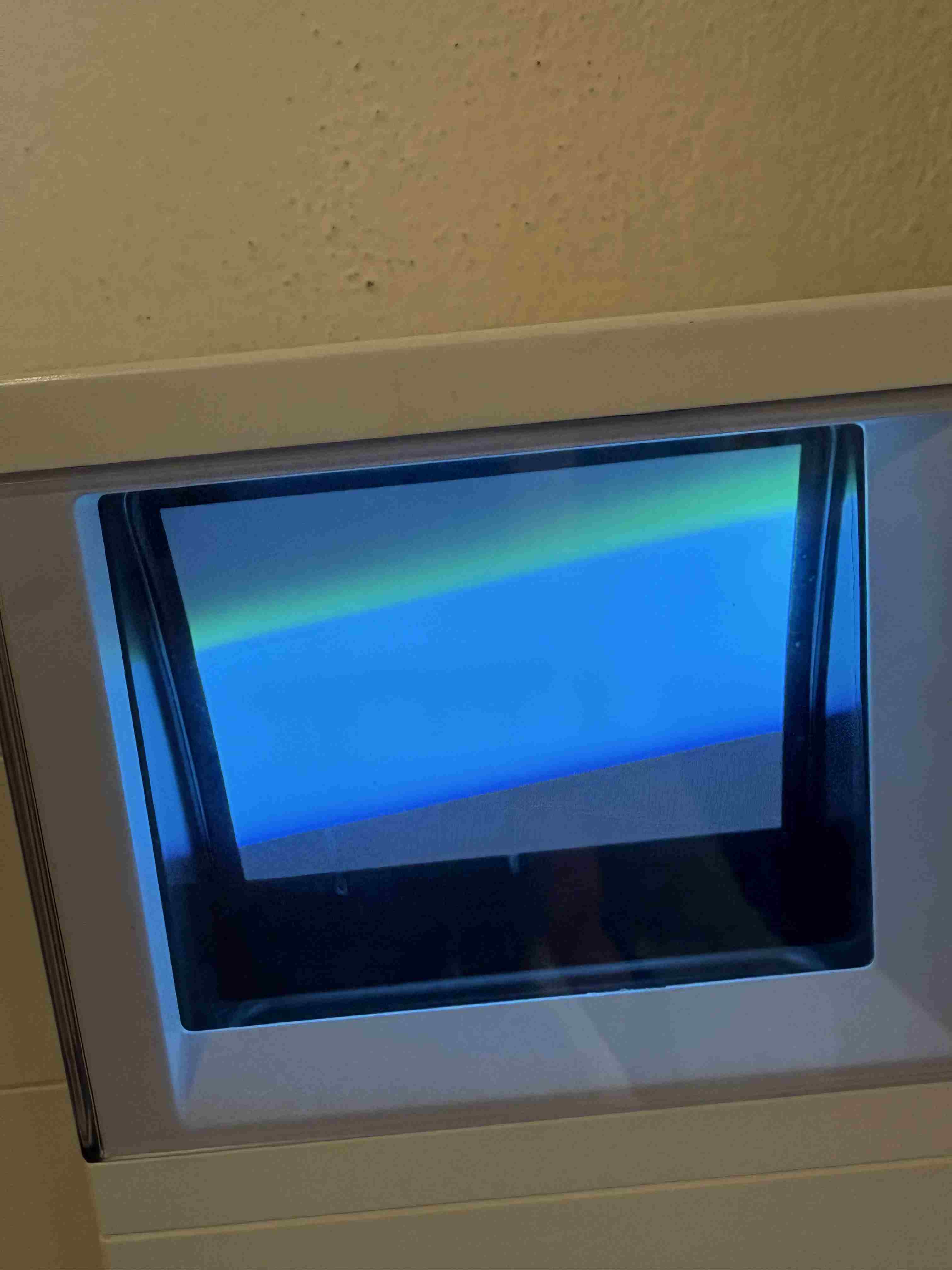 ciao ecco l'immagine che vedo. L'immagine è a schermo intero senza la banda gialla (causa frequenza la foto ha questo effetto). in pratica si vede quanto nella banda centrale. schermo bianco con delle ombre al posto dell'immagine. grazie P -