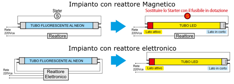 Nel tuo caso con reattore elettronico, lo schema da seguire riportato qui sopra è il secondo, che è uguale al secondo esempio che c'è nelle tue istruzioni, riportato qui sotto: Se invece vuoi seguire il primo esempio che c'è nelle tue istruzioni, su uno dei due estremi del tubo devono esserci per forza indicate le lettere L N, altrimenti si rischia di fare un corto netto. Controlla, perché non credo che la Philips si sia dimenticata di un dettaglio del genere.