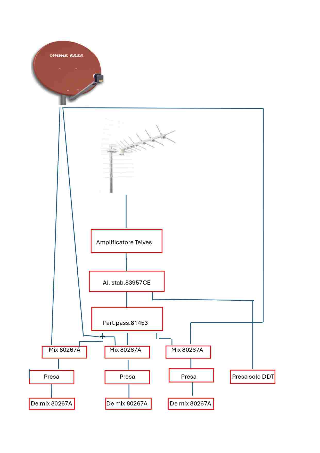 Buonasera, premetto che non sono un professionista ma solo un appassionato. Ho un impianto domestico parzialmente già realizzato in un edificio degli anni '60 con tubazioni molto piccole che possono contenere un solo cavo. Le antenne, la parabola e l'amplificatore Televes sono già presenti. Vorrei portare il segnale in altre stanze e per questo allego uno schizzo del progetto che vorrei realizzare. Sarebbe fattibile? Utilizzare componenti Emmesse a vostro giudizio sarebbe ok? La lunghezza dei cavi dalla parabola al miscelatore è di circa 4 mt mentre dal miscelatore alle prese è di circa 6-7 mt. Invece la lunghezza del cavo dell'alimentatore stabilizzato alla presa DDT è di circa 7-8 mt. Grazie per la disponibilità. Buona serata.
