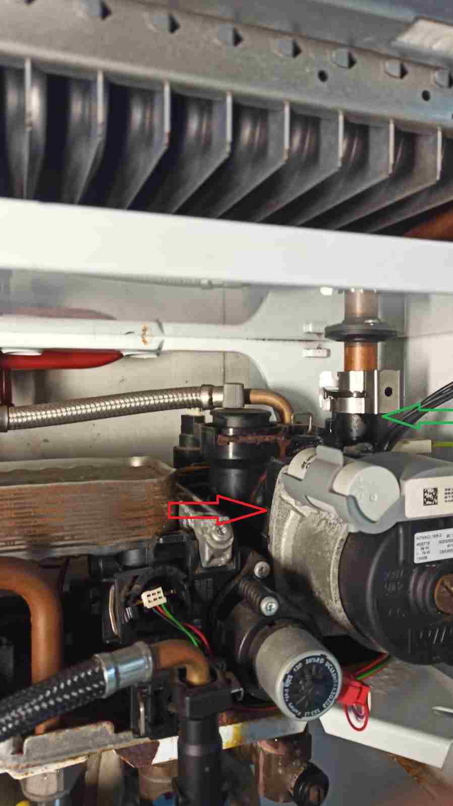 La vite dietro l'ho allentata sembra che gira con troppa forza,... la perdita è sulla giuntura metallo plastica (freccia rossa ) anche tirando le viti a morte , non capisco come possa uscire da li. Poi vedo anche una piccola perdita sulla freccia verde in alto a dx, non penso che sia acqua che salga dal diametro della pompa , però non sono sicuro, domanda : chi è che tiene avvitato il tubo di rame che scende dall'alto? quella lamella color inox ? non vedo un dado o altro . -