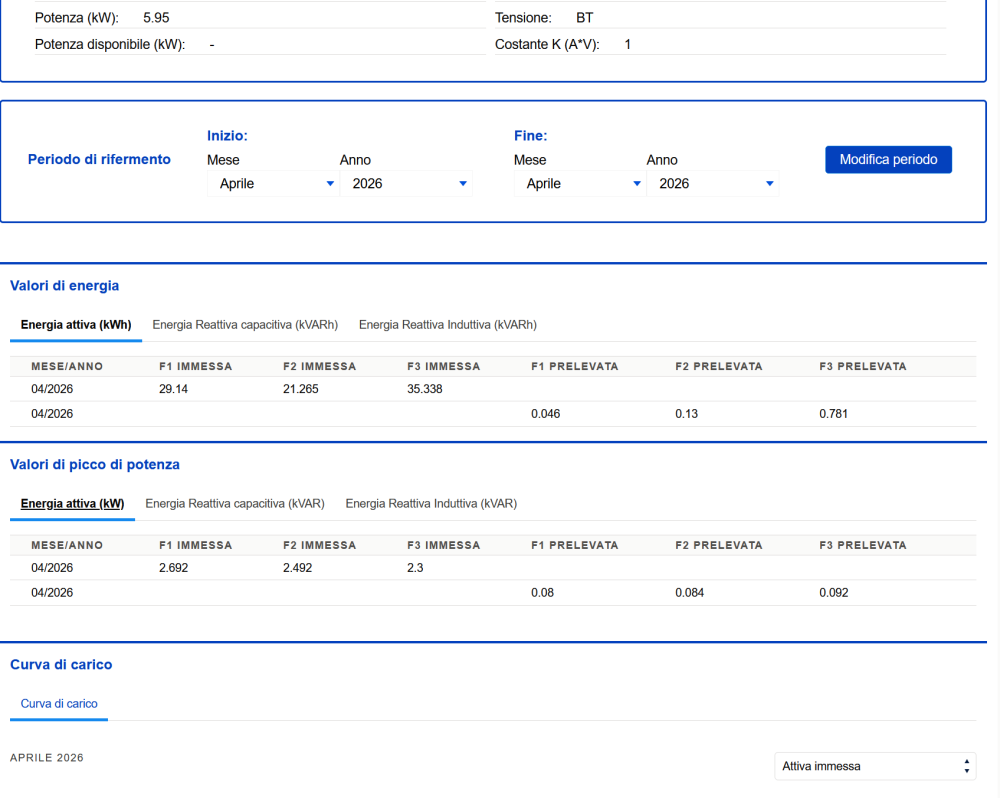 Sul sito di e-distribuzione trovo solo cose simili : ma che non mi aiutano a vedere la corrente immessa... Se infatti guardo la voce "Valori di energia" e sommo F1 F2 ed F3, vado moooooooolto oltre il reale immesso che mi dice l'app essere di 41,26 KwH immessi dal 1 aprile. -