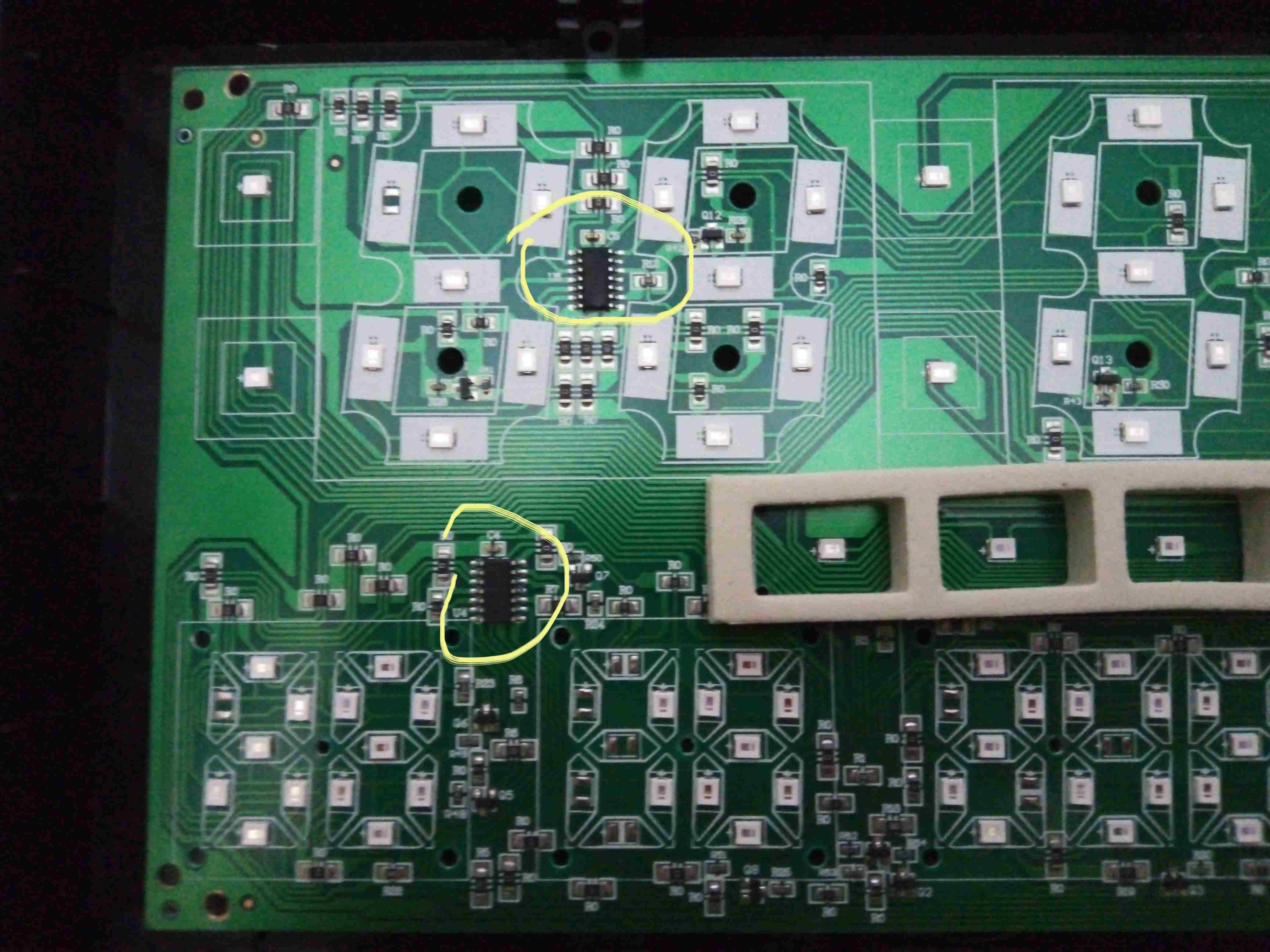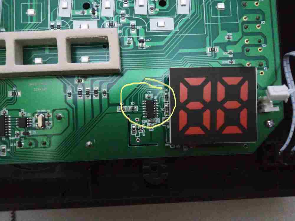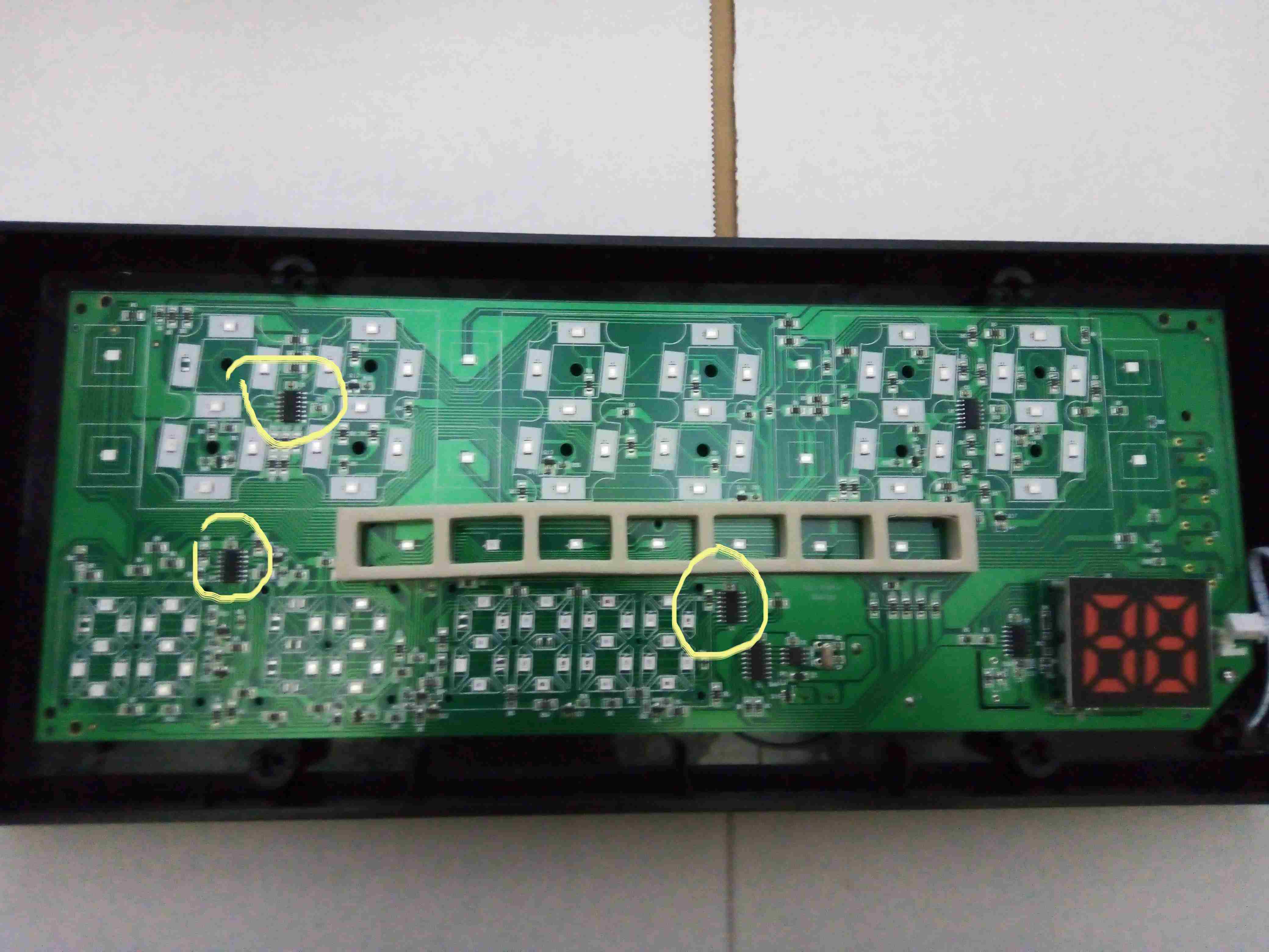 queste sono le foto della scheda , ho cerchiato gli integrati che si surriscaldano, invece quello cerchiato che dovrebbe indicare la Temperatura è spaccato con un piccolo foro, e buona parte dei led non accendono o sono appena accesi, (se li alimento in parte, questi funzionano) , e i comandi per impostare l'orario non funziona del tutto