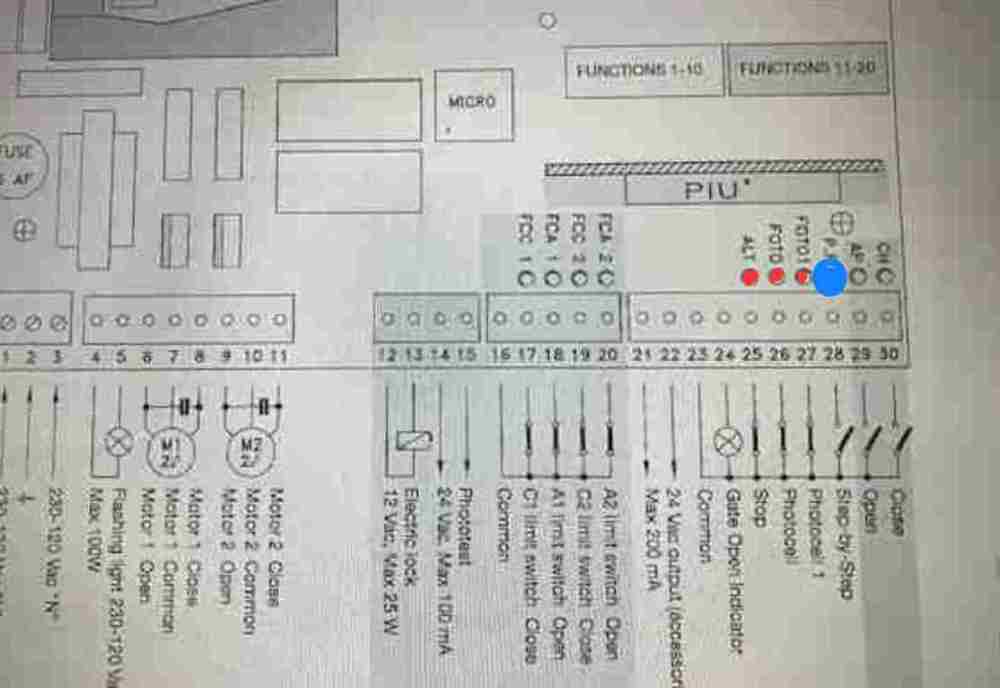 Dalla foto che hai mandato tu,quella con la pagina del manuale Devi avere acceso 3 led fissi e uno che si accende solo al comando di open. i led foto e foto1 si spengono quando il fascio delle fotocellule viene interrotto il led alt si spegne quando si preme il pulsante di stop i led accesi devono essere 🔴 alt (ingresso 25) 🔴 foto (ingresso 26) 🔴 foto1 (ingresso 27) il led di open 🔵(ingresso 28) si accende solo al comando,poi si spegne ps: pure open si accenderà rosso