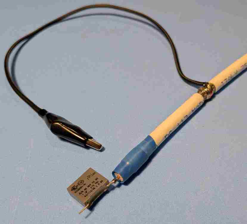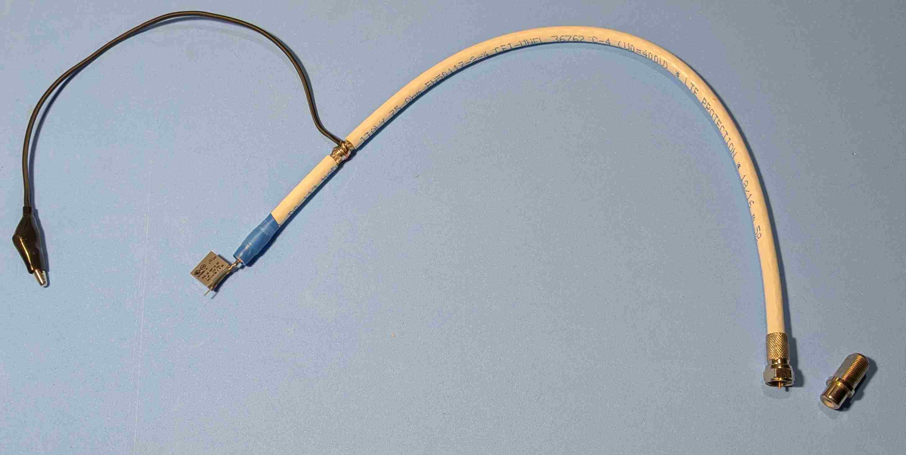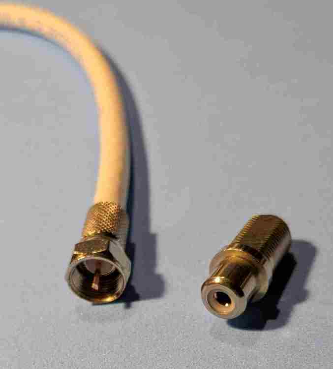 Questo è come si presenta. Non fare caso alle lunghezze, è solo per rendere l'idea. Dettaglio connessioni: connettore F da avvitare sul coassiale e adattatore F femmina- RCA femmina. Così lo puoi collegare all'ampli mediante un altro cavetto RCA-RCA maschio. Dettaglio per il "puntale": ho messo un poliestere così perché quello avevo. -