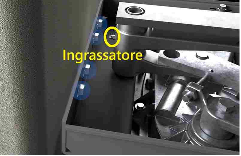 Ciao RennaC, https://www.atecnica.it/file/ist-bft-altair-p-istruzioni-montaggio-collegamenti-wiring-liaisons-atecnica.pdf?srsltid=AfmBOorZf3BmYe4XvVRAC7uZ_1IlsIy25WHHOZyWXJ-OrkXkrQ9xNTza Ok, bella mossa, per caso i motori sono i CAME mod. FROG-A? https://came-cdn.thron.com/static/DEECRB_FA02027M04_FKJY2Q.pdf?xseo=&response-content-disposition=inline%3Bfilename%3D"CAME-fa02027m04.pdf" Quanti anni hanno i motori e da quanto non fai nessuna manutenzione? Se sblocchi i motori, le ante girano bene, oppure c'è qualche impedimento? Apri i coperchi delle casse e togli anche la leva a mezza luna che collega il motoriduttore alla staffa dell'anta e vedi se il cancello si muove bene a mano Certo, l'ideale sarebbe togliere completamente le ante e relative staffe e giunti meccanici vari, pulire tutto l'eventuale grasso vecchio e rimetterne di nuovo. Altrimenti per iniziare, devi usare un ingrassatore a siringa e "sparare" il grasso attraverso il relativo ingrassatore posto sulla staffa delle ante, intendo questo: Togli anche la leva a mezza luna che collega il motoriduttore alla staffa dell'anta e vedi se il cancello si muove bene Posta un paio di foto della tua situazione che ci capiamo meglio -