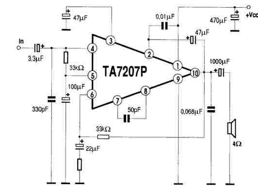Ho ricuperato dallo scasso 2 integrati TA 7208P . Ho montato il primo con questo schema . Come collaudo ho inserito un segnale prelevato dall'uscita segnale di una radiolina a transistor tenedolo a volume ultrabasso. . Il seganle subisce un forte e chiara amplificazione. Il collegamento all'uscita del TDA 7000 diversamente mi da invece un segnale notevolmente distorto. Chiedo gentilmente uno schemino come adattatore da interporre fra i due apparati. Grazie