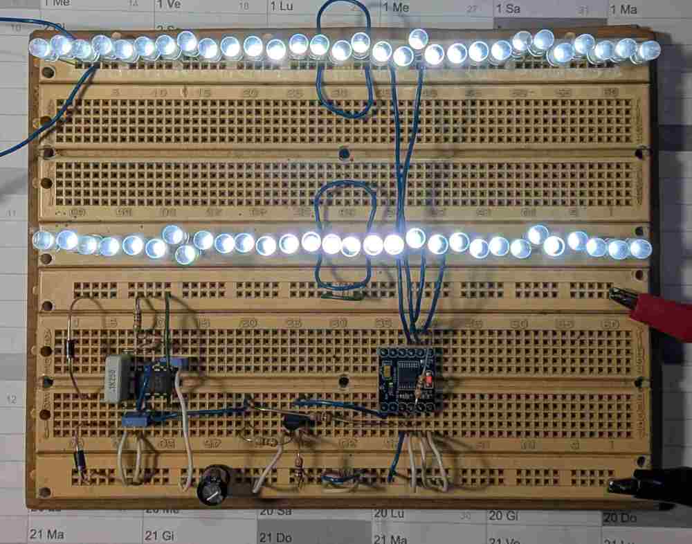 Finito, sembra funzionare correttamente. E questa è la tensione misurata in uscita: Ho provato anche a sbilanciare il numero dei LED in antiparallelo e la schedina drv non fa una piega. Il tutto alimentato a 5V assorbe circa 0.22A, ai LED non arrivano più di 3V e quindi sono abbastanza tranquilli. Si potrebbe spingere un po' più di corrente, certo, ma dato che non hai le resistenze di limitazione sui LED io non te lo consiglio. Buona serata.