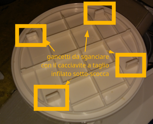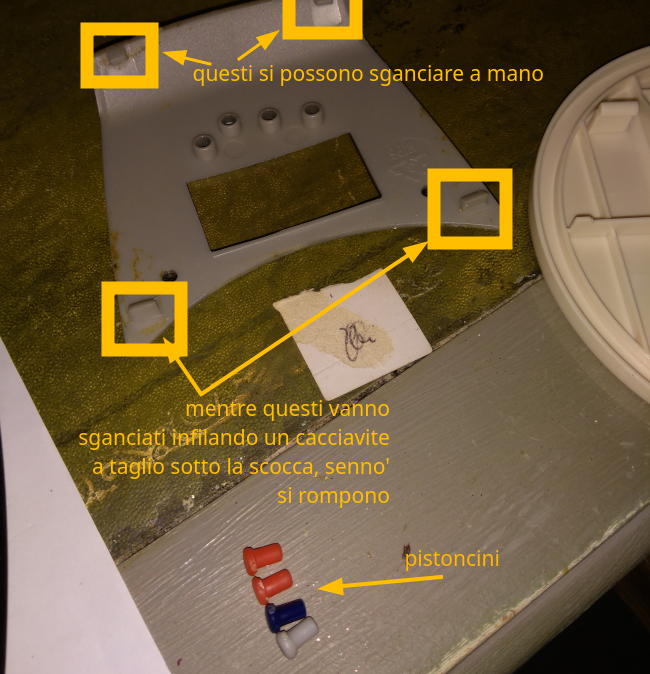 Oggi questo thread mi ha aiutato nell'impresa di aprire questo modello esatto di bilancia e cosi', seguendo il suggerimento di un moderatore, "riapro" questo topic per dare il mio contributo, dato che fra i messaggi mancava la soluzione esplicita. Parto con il dire che vi serviranno un cacciavite a stella ed uno a taglio (a stelo lungo, serve per raggiungere dei gancetti), tutto qui. 1. Svitare le sei viti sottostanti, la scocca sembra venire via ma non viene; qui e' dove si fermano tutti e dove mi ero fermato anche io... Nota: fare attenzione perche' i 4 bottoni della plancia hanno dei piccoli pistoncini in plastica sottostanti che non sono incollati, quindi saltano via che e' un piacere. 2. Partire staccando la plancia: non e' incollata e' solo ad incastro. Seguire la figura: 3. Ora si deve smontare il piatto. Si procede allo stesso modo: non e' incollato ne' avvitato, e' ad incastro. Infilare il cacciavite a taglio sotto-scocca e con delicatezza sganciare i gancetti di plastica: 4. Fatto! la Bilancia Elettronica Bifinett Kh1156 e' stata smontata. Nel mio caso il pulsante dell'accensione si era consumato e faceva molta fatica ad accendersi/spegnersi. Ho scambiato - dissaldato/risaldato - il bottone dell'accensione con quello del timer (non uso questa funzione) ed ora la bilancia e' come nuova. Puo' sembrare strano spendere tanto impegno per una bilancia. Eppure vi devo dire che ne ho comprate diverse a causa della "rottura" di questa: nessuna pero' come lei, robusta e sempre precisa, ed include anche la temperatura dell'ambiente in gradi centigradi. Insomma, piccola gioia che e' valsa la pena riparare. -