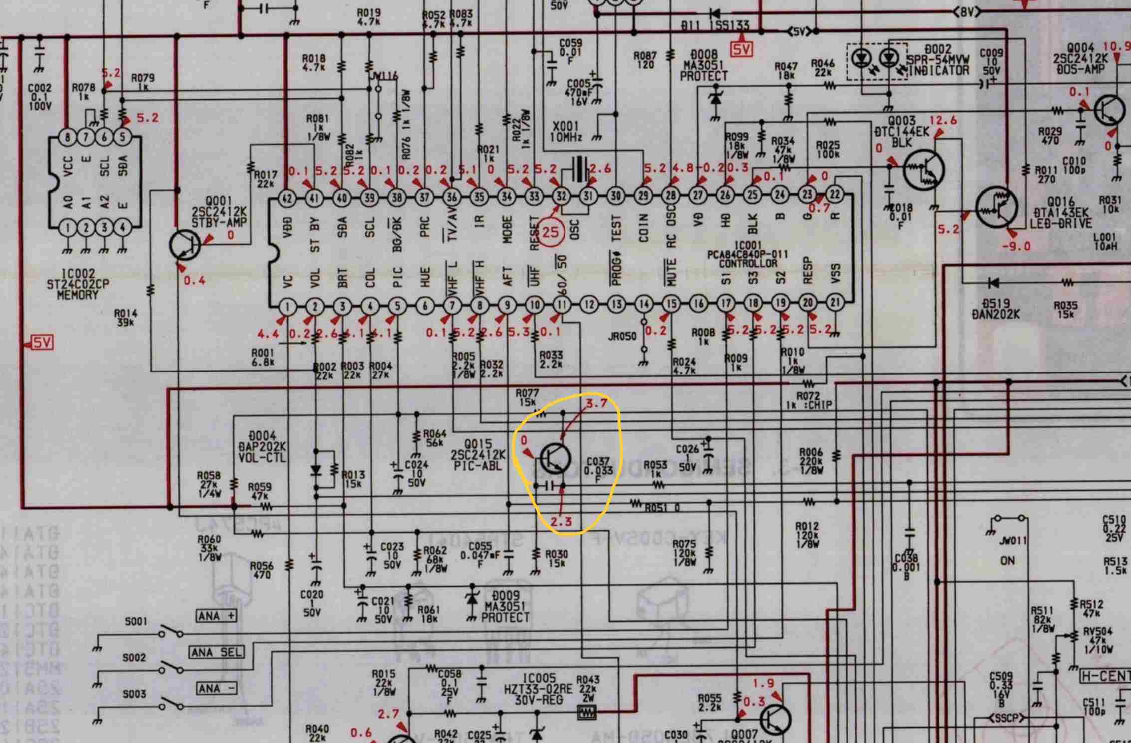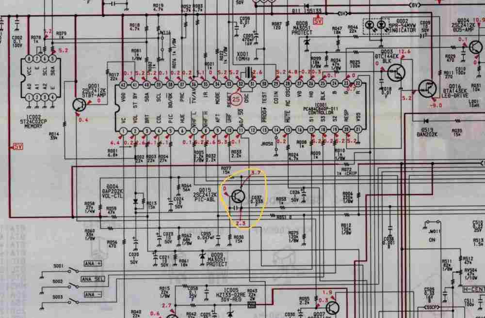 Ciao , ho seguito a ritroso partendo dal pin 19 del tda 3508 i componenti , facendo le misure che indica lo schema del manuale di servizio di SONY e sono arrivati fino a Q015 che credo faccia parte del circuito ABL e lì penso di aver trovato qualcosa che non va , facendo le misure mi da : Emettitore (E): 3,8 Volt , Base (B): 3,7 Volt , Collettore (C): 1,9 Volt le misure le ho fatte prendendo come negativo per il puntale del multimetro il pin 14 di IC001 , invece lo schema dice che dovrei avere Emettitore (E): 2.3 Volt , Base (B): 0 Volt , Collettore (C): 3.7 Volt che poi sono quelli che dovrei avere su pin 19 del TDA , quindi cè qualcosa di strano.