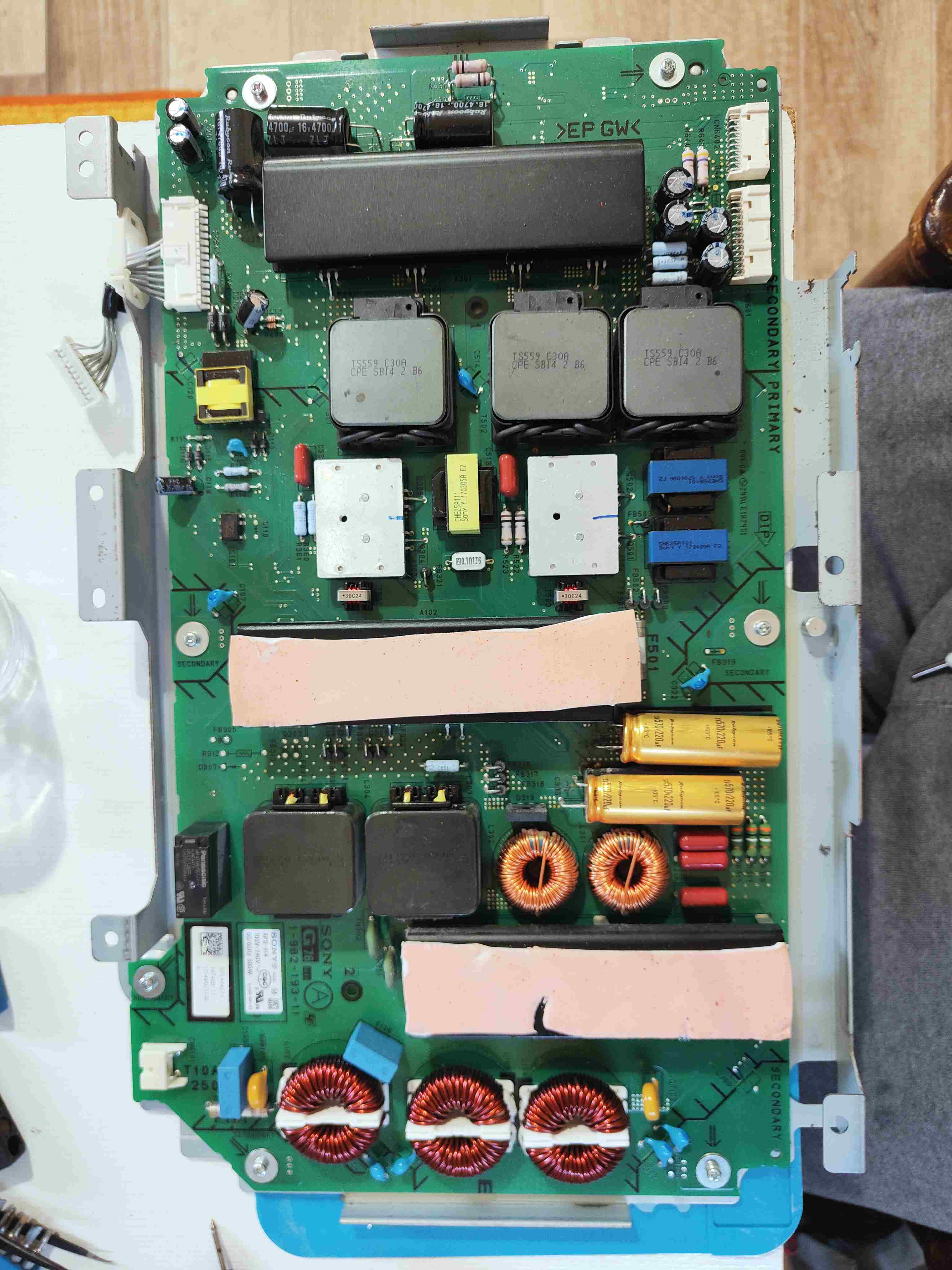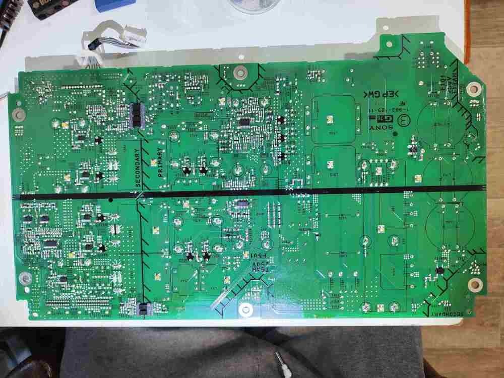 Buonasera a tutti Sto provando a riparare questa scheda di alimentazione della TV Sony Bravia ma non riesco a capire cosa succede, ho controllato i condensatori di filtro è lì arrivano 320 volt di tensione, poi ho controllato i due cavetti bianchi che suppongo siano i cavetti di standby e danno una tensione di 2.1 volt quindi a questo punto Io suppongo che la scheda di alimentazione non sia il problema ma è il problema la mainboard, voi Che ne pensate Avete dei consigli? Allego le foto fronte retro della scheda di alimentazione. Questa è la prima volta che posto, spero sia la sezione giusta.