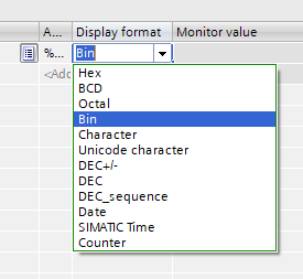 Immagino tu voglia usarlo in una Watch table (tabella di visualizzazione) quindi usa il Bin se invece quello che vuoi fare è indirizzare dentro il plc il singolo bit di una Merker Word per esempio la MW100 ti basta fare M100.0 , M100.1 per il primo bit o per il secondo e così via.. Se invece indirizzi per esempio la word di un DB per esempio la DB_pippo.var_Pluto allora scriverai DB_pippo.var_Pluto.%x0 per il primo bit o DB_pippo.var_Pluto.%x1 per il secondo bit e così via...