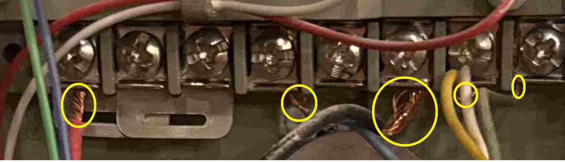 E allora se suona sempre lo stesso ronzatore, sia dalla targa esterna e anche dal pulsante al pianerottolo il problema dovrebbe essere appunto sul pulsante esterno. Se puoi / vuoi metterci le mani da solo (regolamento e accordi condominiali permettendo), dovrai aprire la targa e controllare lo stato del tuo pulsante, magari scollegare il filo del ritorno e toccarlo per un attimo / cortocircuitandolo con quello che dovrebbe fare da comune per tutti i pulsanti. Casomai apri la pulsantiera esterna, senti se la molla del pulsante funziona ancora bene, fai un paio di foto ed indicaci qual è il tuo pulsante che vediamo com'è messo, ed inoltre se ce l'hai, spruzza un po' di spray detergente / disossidante per contatti elettrici. Quasi sicuramente non cambierà nulla, ma per dare un ordine al cablaggio, se sai usare un cacciavite ed una forbice, puoi benissimo sistemare tutti i fili uno per uno nel tuo citofono, tagliando un po' il rame in eccedenza, scollegando e ricollegando un filo alla volta (se necessario spellando nuovamente la testa), in modo che la guaina isolante NON entri nel morsetto, ma che il rame sia completamente dentro. L'unico filo che si potrebbe "salvare" (per modo di dire) è quello grigio nel morsetto 1, guarda la foto in cui ho cerchiato il rame in eccedenza. Vai tranquillo, non c'è problema, NON prendi la scossa; quindi, puoi toccare i fili anche con le mani. Puoi usarlo per testare il pulsante esterno, scollega il filo dal tuo pulsante, imposti il tester in Ohm sulla scala più bassa possibile o nella funzione cicalino (se ce l'ha) e metti i due puntali sui due morsetti del pulsante stesso, quindi premendolo, il tester (se è digitale) dovrebbe indicarti "000" e/o far suonare il cicalino. Casomai posta una foto dello strumento. Se invece il pulsante non funziona, allora il display dovrebbe indicare sempre circuito aperto con "OL" o "1" a seconda del tester stesso -
