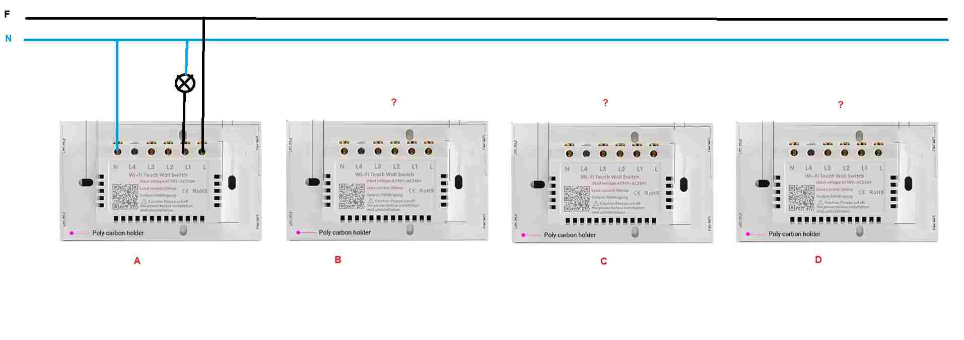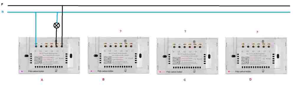 Probabilmente è banalissimo, ma vorrei accendere la lampadina dell'interruttore WiFi (A) anche dagli interruttori B-C-D Sia in manuale che attraverso l'applicazione SMART LIFE Potete aiutarmi? Grazie Jerry -