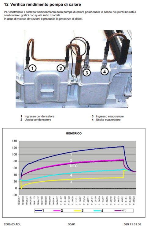 Posto che la probabilmente la mia AEG T59840 è basata sulla piattaforma ENV06HP (quella del service manual che hai postato tu), hai davvero misurato 120 gradi celsius sull'ingresso condensatore? Mi sembra una temperatura molto elevata per una pompa di calore di quel tipo Chissà perchè sulla piattaforma EDR 2000 (un pò più vecchia ma molto simile) quella temperatura è nell'ordine della cinquantina di gradi.... la pompa di calore sembra essere la stessa. Anche se una si riferisse alla temperatura dell'aria nello scambiatore e l'altra alla temperatura del gas nei tubi, è una differenza molto grande. -