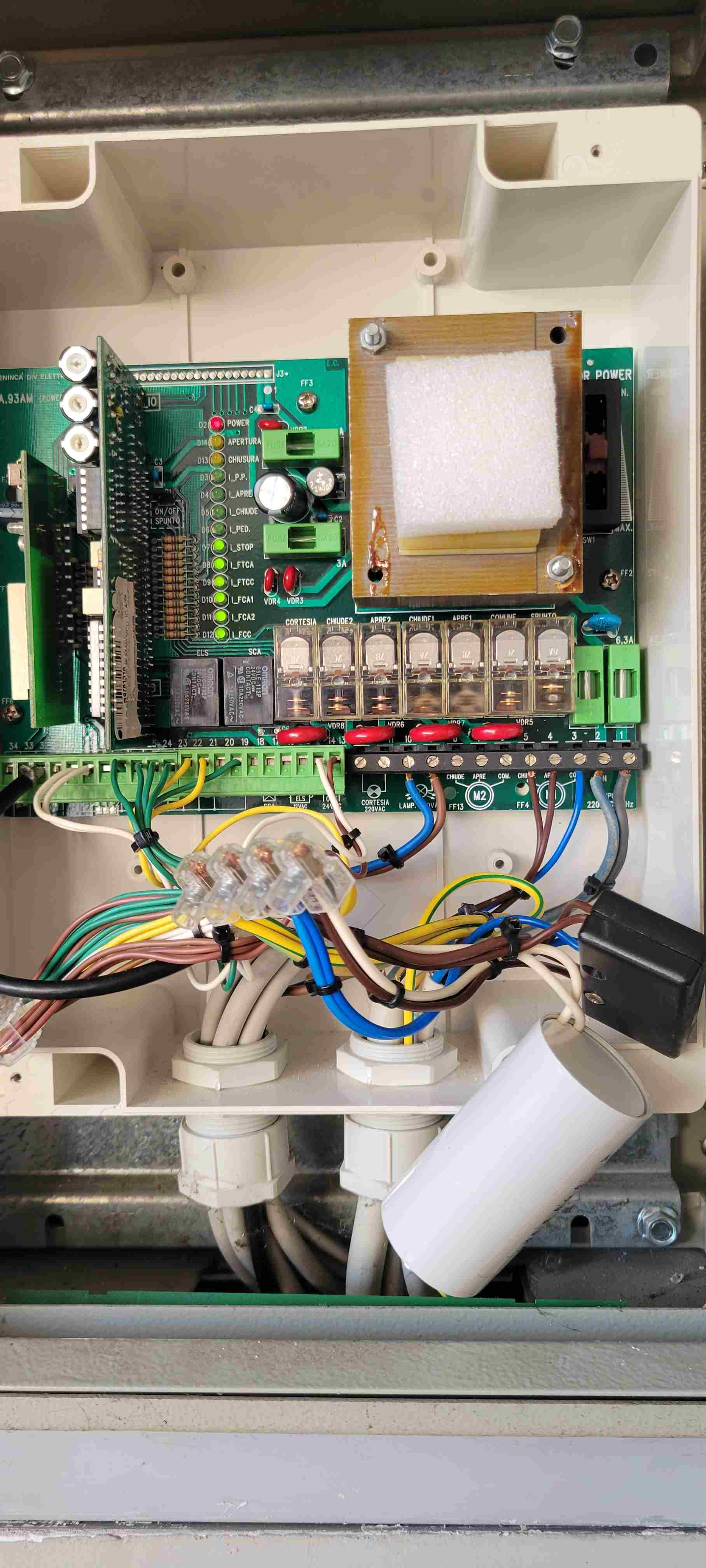 Grazie della disponibilità. Una precisazione: il problema non sempre si presenta. Prima di tutto che motori ci sono? Marca e modello / articolo preciso, grazie Presente un solo motore cancello a una sola anta (vedi foto allegata) Ci sono i finecorsa elettrici nei motori? Veramente se ci sono non so dove sono posizionati. I lampeggiante continua a funzionare quando si fermano i motori, oppure si spegne anche quello? A quanto pare il lampeggiante resta spento Come si presentano i led sulla scheda quando succede il problema? Per il momento non ho ancora verificato I condensatori di spunto dei motori, quanti anni hanno? Il condensatore di spunto (quello all'interno del pannello/scheda) ha 24 anni!!!! Com'è tarata la slitta SW1 della potenza / forza motori? Penultima scelta prima del MAX.