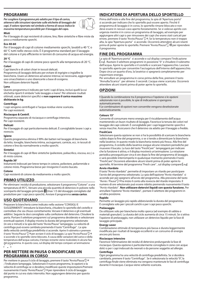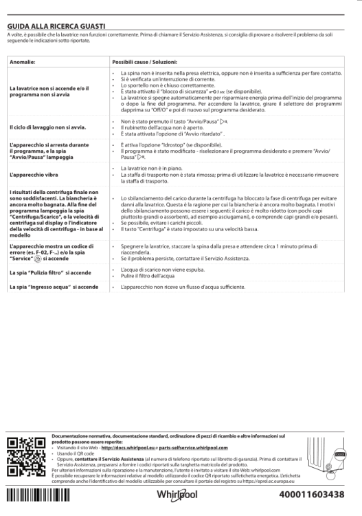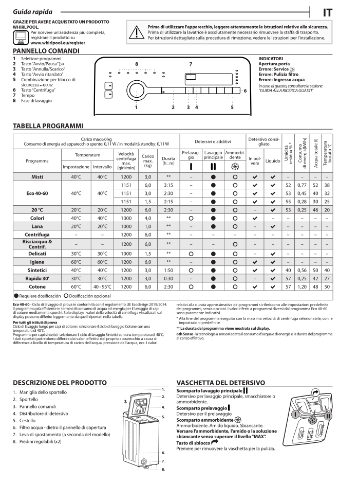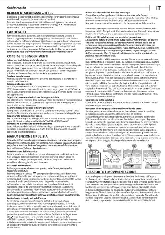 Mamma mia, se penso che nel manuale della mia ci sono anche delle foto, un paio di fogli aggiuntivi allegati e il test per la durezza dell'acqua (sponsorizzato, ma vabbè) 🤐… Facci sapere poi come va a finire con l'assistenza OT: non so se sia la tua prima Whirlpool a carica dall'alto, e siccome dubito che abbiano risolto il problema della ruggine alla lamiera del coperchio, ti consiglio di asciugare per bene alla fine di ogni lavaggio la sua parte interna; così eviti il mal di testa di riverniciarlo (a me è successo dopo nemmeno due anni dall'acquisto) e/o cambiare la molla che lo tiene aperto, che anche se è rivestita di plastica col tempo marcisce lo stesso -