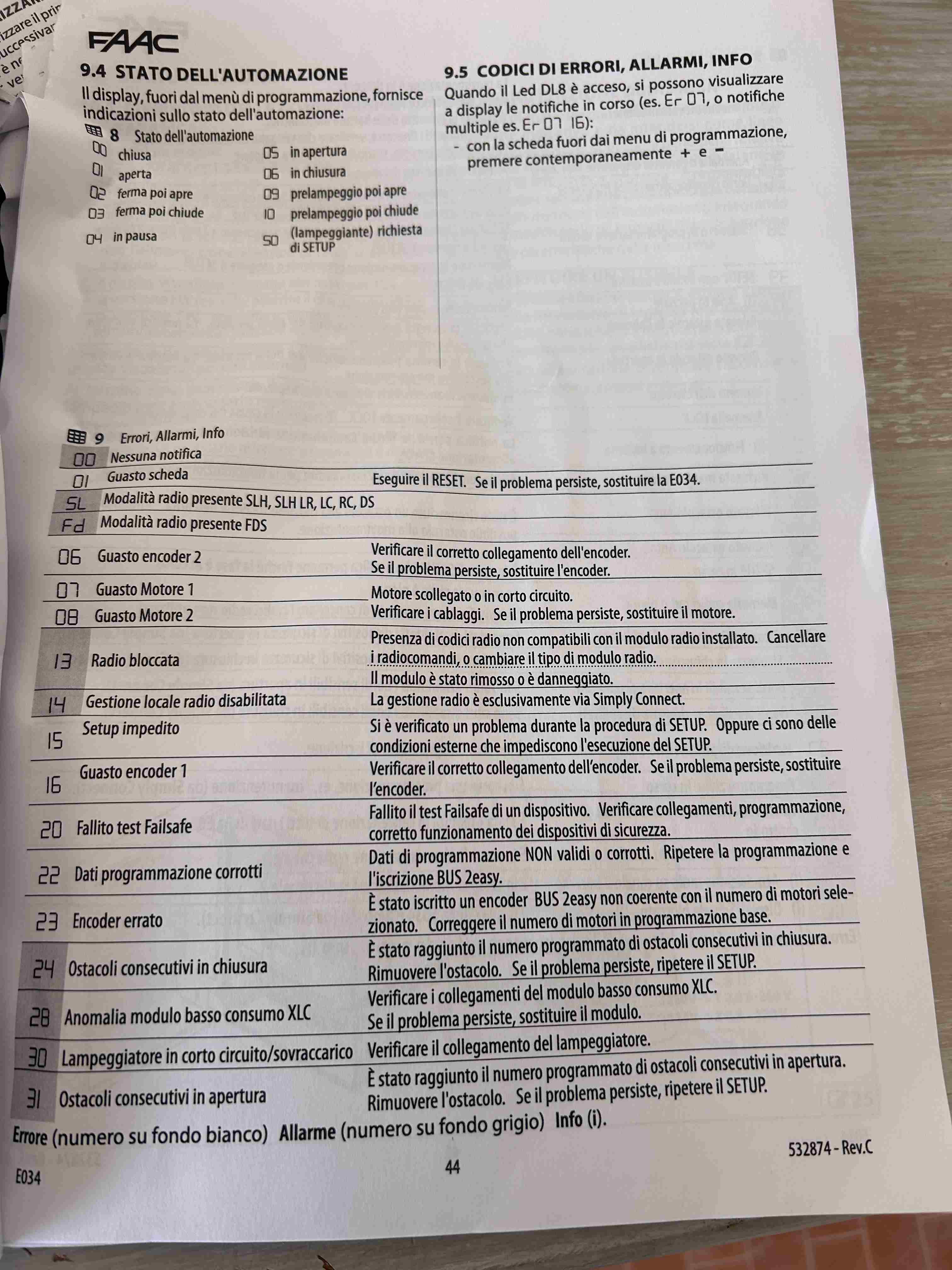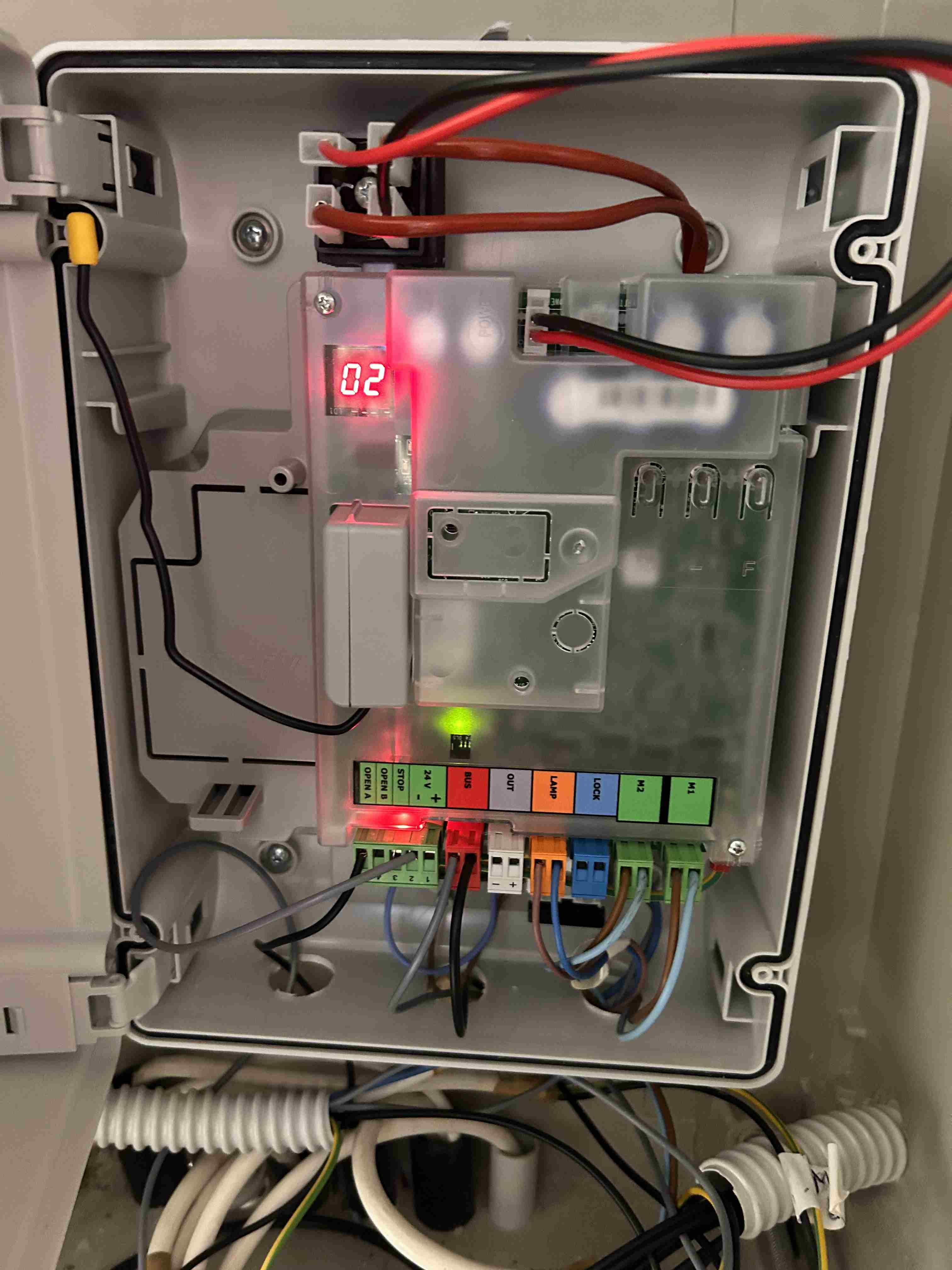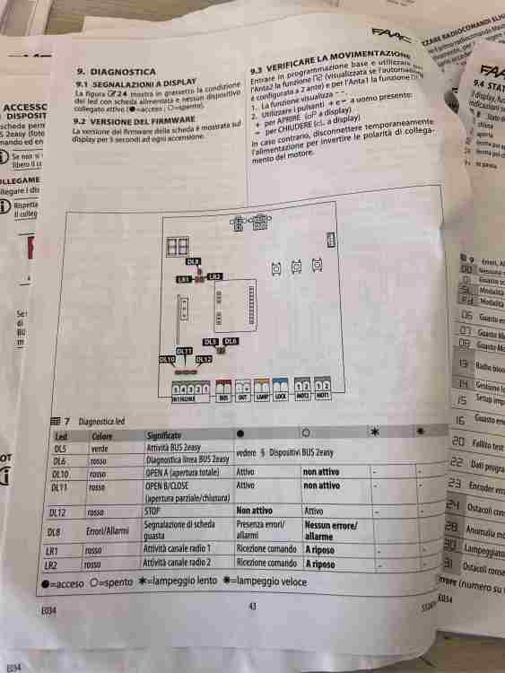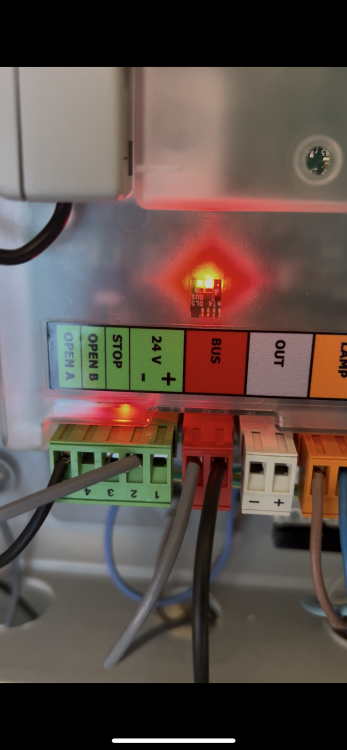 Buongiorno a tutti! @simuffa @giugn76 @ROBY 73 @piergius le fotocellule interne sono ok pulite e senza acqua dentro..i led sono accesi entrambi blu. Stamattina sono riuscito a documentare con un video cosa fa la scheda quando il cancello impazzisce…praticamente quando sta per richiudere si accede per un secondo il led rosso del bus e si riapre (lo fa due volte) allego foto perché il video non me lo fa caricare. Quindi abbiamo chiuso il cerchio e direi che il problema sono le fotocellule. proveremo ad iniziare ad escludere una coppia alla volta stando attenti. avete qualche consiglio? Formiche o animali li escluderei perché sono pulitissime dentro e i cavi sono praticamente cementati…la mia preoccupazione sono i cavi vecchi. oggi pomeriggio se riesco faccio le foto delle fotocellule interne. la scheda e al Interno di un quadro elettrico stagno. grazie -