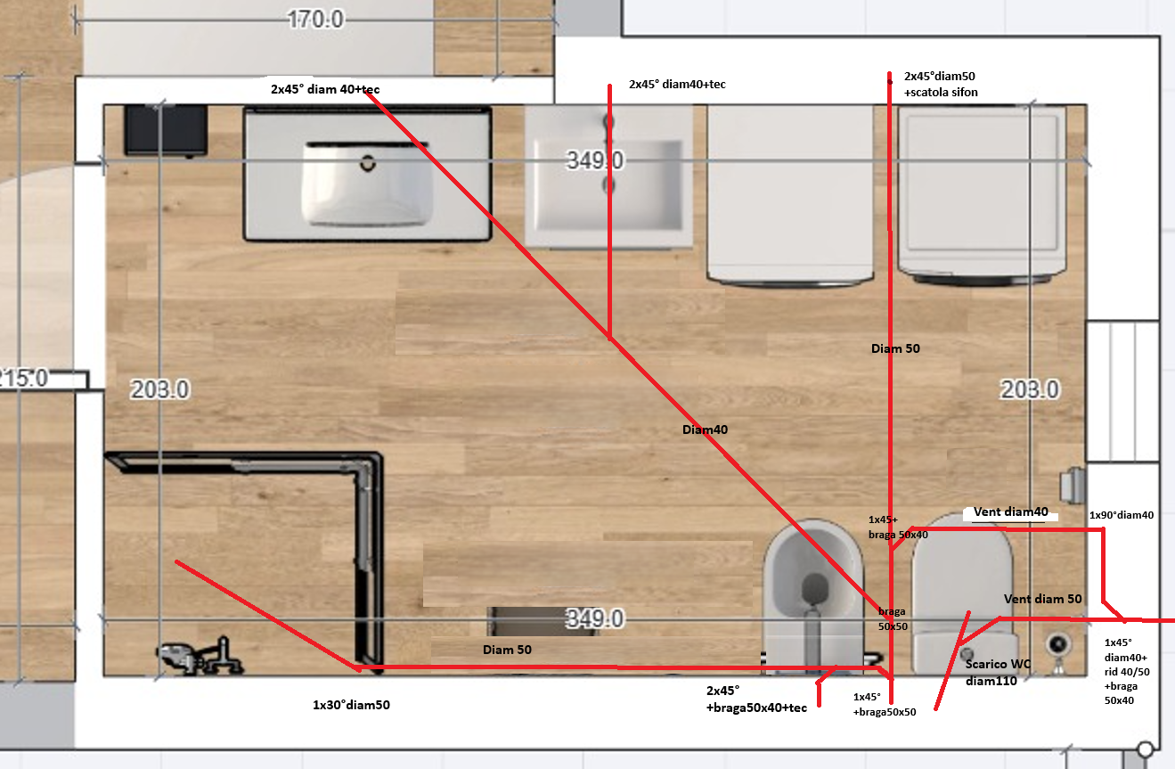Buongiorno, devo realizzare un nuovo impianto di scarico del bagno al piano terra con linea scarico WC divisa dalle acque saponate; come si vede nel disegno allegato segnato le linee in rosso e messo commenti, pendenza prevista 1..1,5% si accettano consigli grazie.