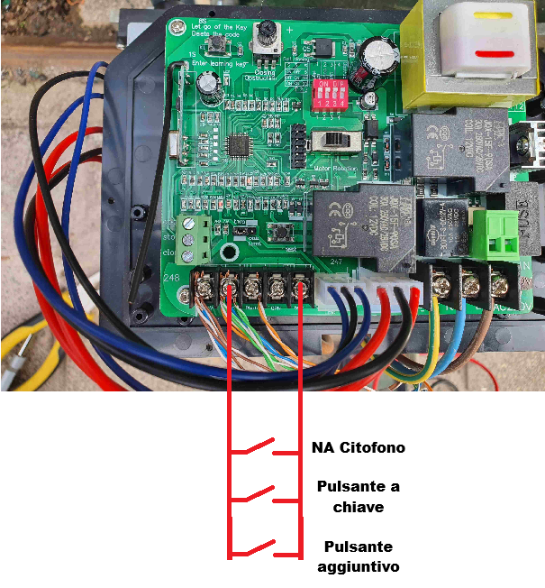 Buongiorno, ho installato un motore per cancello scorrevole Vevor, tutto funziona bene solo che vorrei collegare l'apertura anche da videocitofono, il mio un Urmet ha contatto NO, e anche un pulsante esterno e/o un selettore a chiave. Allego una foto della scheda, gentilmente qualcuno mi sa dire i giusti collegamenti da fare, grazie.