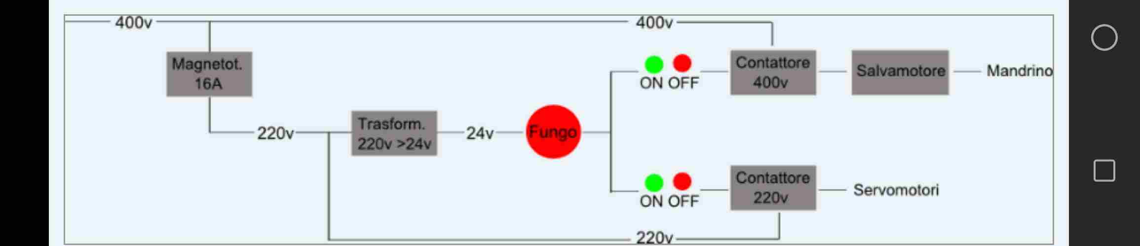 Dopo essermi documentato un po, sto valutando la possibilita di cablare il quadro comandi in bassa tensione e con contattori, come raccomandato da tutti. Lo schema DOVREBBE essere il seguente, ma comunque chiedo conferma. Purtroppo mi sono arenato sulla scelta sia del trasformatore che dei contattori. Trasformatore: Non ho idea della potenza necessaria. Ho letto che dovrebbe essere superiore all'assorbimento dei contattori che alimenta, ma non trovo questo dato sulle schede tecniche dei contattori. Inoltre di alimentatori ce ne una miriade di tipi. Contattori: 1) Ho capito che mi servono con autoritenuta ma non trovo scritto nelle schede tecniche se il contattore ne e' dotato o no, perche da quanto ho letto pare che non tutti ce l'abbiano. 2) Non riesco a capire la questione dei contatti NO e NC, se si riferisce al circuito di controllo o ai contatti di potenza o cosa. Per i contatti di potenza nel contattore per la linea a 400 CREDO mi servirebbe con 3 contatti NO e per la linea 220 con 2 contatti NO. Pero' nel contattore in foto nel post precedente (e in molti altri che ho visto), oltre alla morsettiera "di potenza", segnata L e T, ce ne una sulla destra marcata 21NC e 22NC che non ho idea a cosa serva, se la scheda del contattore si riferisce a quella, e come mi servirebbe. In definitiva, vista la estrema complessita della materia e la mia scarsissima preparazione, vorrei capire se potete aiutarmi ad acquistare i componenti giusti, (evitando di buttare soldi inutilmente) oppure se e' meglio riconoscere che la cosa non e' alla mia portata e rinunciare, tornando al progetto originario di cablare tutto in alta tensione. -