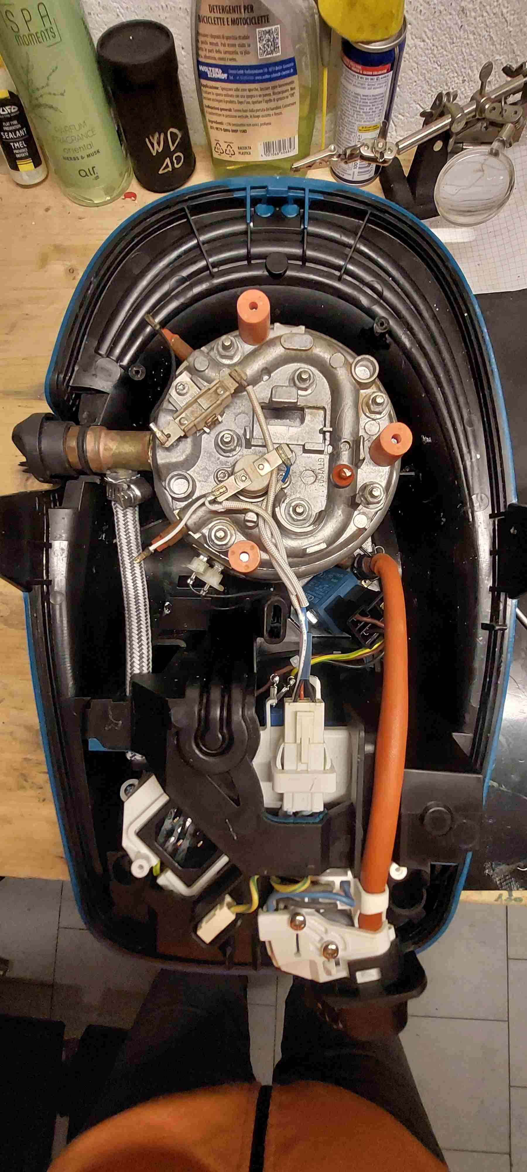 Ferro da stiro Rowenta Dg8410 esce acqua dalla piastraStefano Dalmo ha risposto a carloph alla discussione in Piccoli elettrodomestici Se vuoi e ci tieni a ripararlo tu , devi mettere a parte la paura e proseguire nello smontaggio , altrimenti lascia stare e portalo da un riparatore . tieni presente che non c’è un vademecum su come si smonta un ferro da stiro , ce ne sono centinaia di modelli , e molte parti sono intuitive . il tecnico non ha gli schemi di ogni ferro da stiro , guarda e studia come poterlo rimuovere , se ci sono coperchi ad incastro o avvitati . immagina che tu ti sei fermato di fronte a misurare sui fili che tieni avanti agli occhi , quando basta svitare quelle due viti e togliere la parte in plastica marrone . , anzi mi pare di intravedere gli spinotti attraverso quei vuoti sottostanti . tu mi dirai , ma io faccio altro ! e ma … mettici un po di non arrendersi subito .