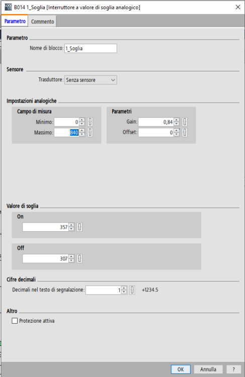 Buongiorno, per inserire un macchinario in una linea abbiamo sostituito il logo con un nodo ET200SP, ho bisogno di capire il valore di scalatura di un ingresso analogico. l'ingresso è quello collegato all'I7 e credo che la scalatura sia qui: Significa che il trasduttore va da 0 a 84 corretto?