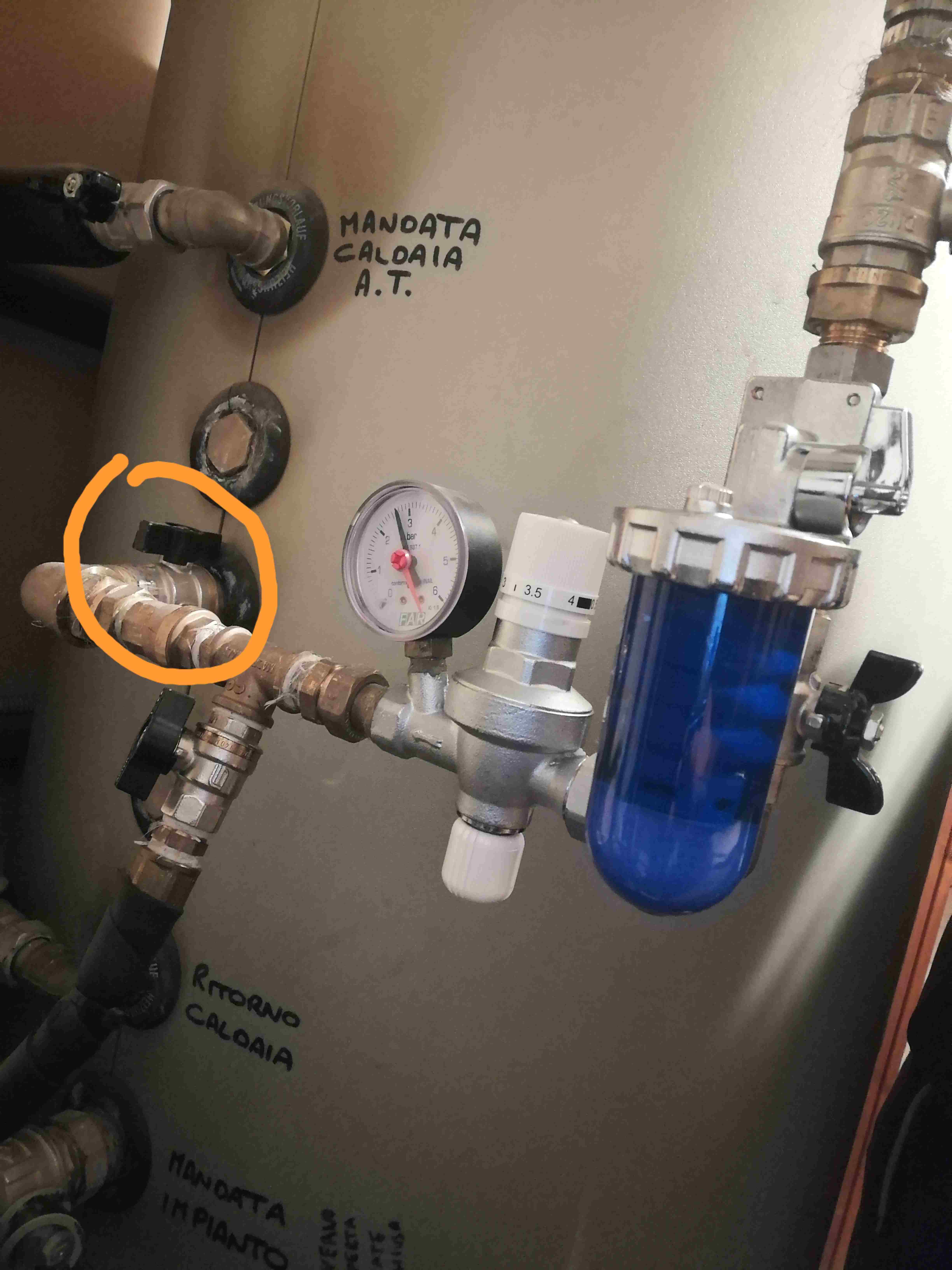 Buonasera, apro un altra discussione, non voglio intasare quella aperta sulla caldaia (Mercoledì vieni il tecnico a controllare l'impianto) così vi aggiornerò sulla vecchia discussione già aperta. Per mera curiosità personale mi spiegate come va tarato il gruppo di carico? Mi spiego meglio, il rubinetto segnato in arancione va lasciato serrato oppure va svitato? Uguale quello blu, essendoci una scala di pressione va tarato sulla pressione desiderata? Ultima domanda, il manometro integrato Che segna la pressione, misura a valle oppure a monte della valvola di non ritorno? Grazie a chi mi darà una conoscenza in più. -