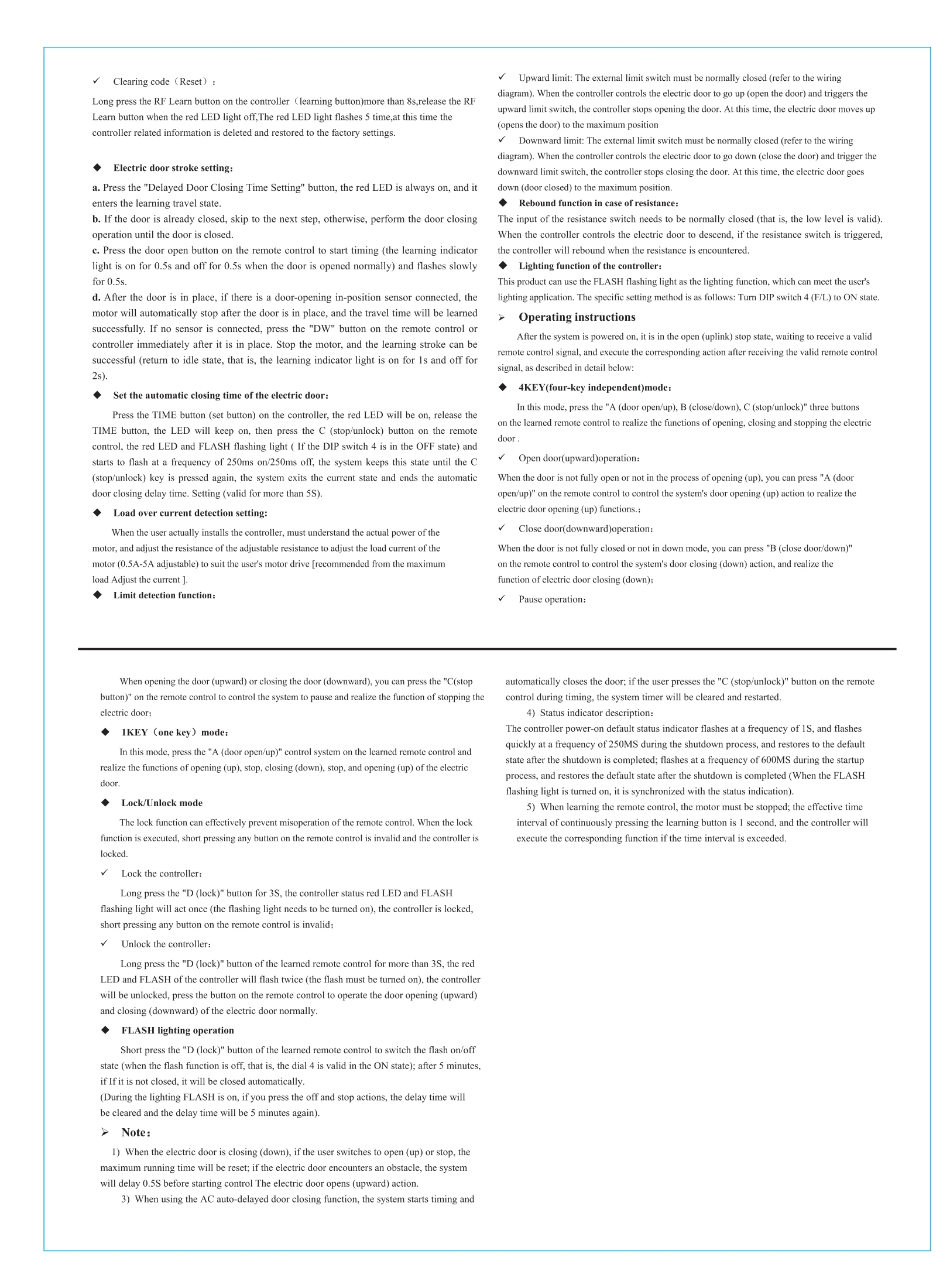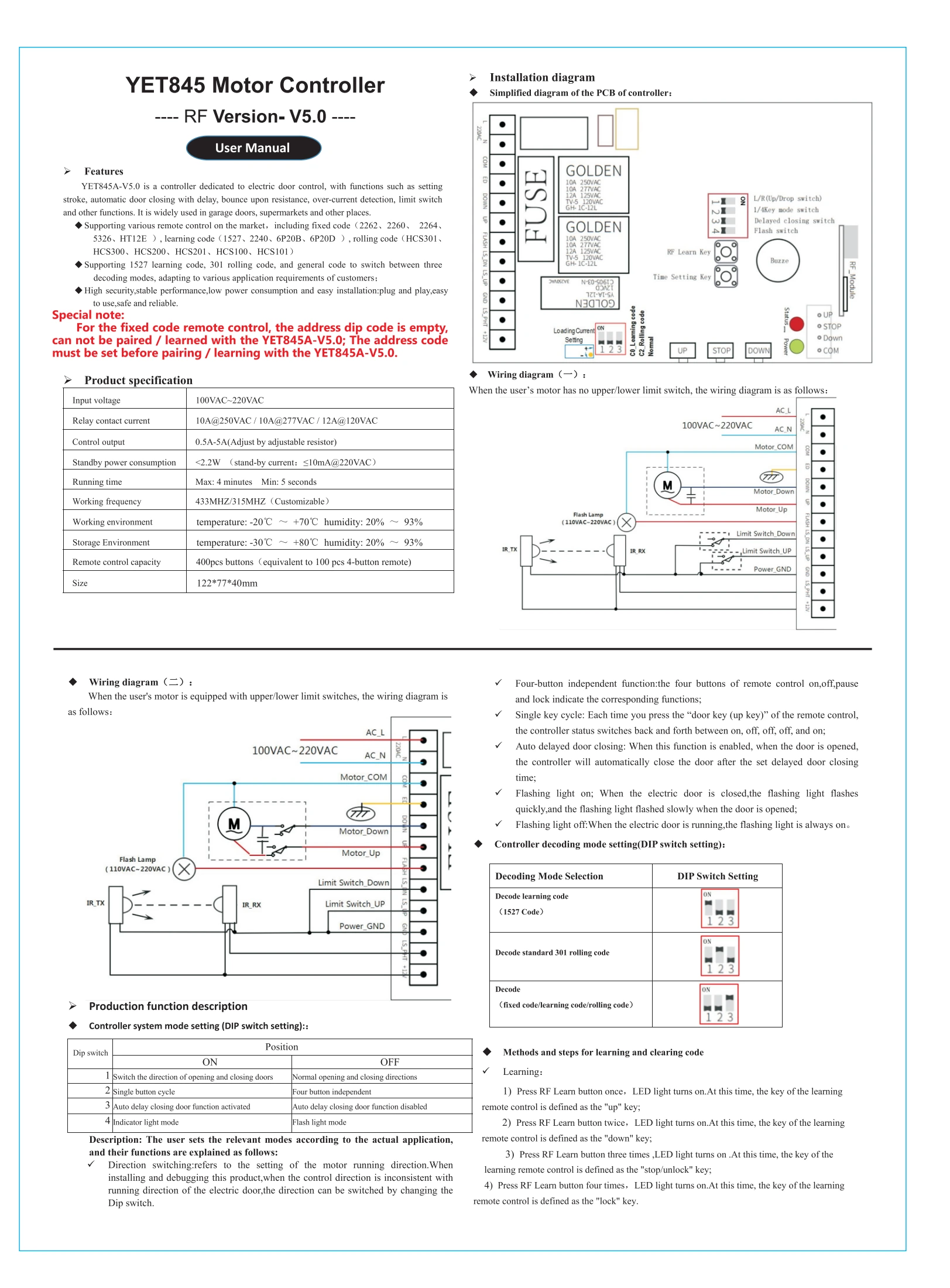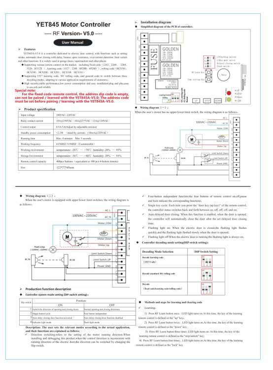 Salve, sto provando a programmare il ricevitore in titolo per avere un comportamento simile a quello visibile su questo video. Lo scenario è quello del video: i pin sono impostati allo stesso modo, le fotocellule erano già ponticellate, ho aggiunto due leds 220Vac (come da video, simulano il motore), telecomando in modalità 1 bottone. Non riesco ad impostare il tempo di alzata/discesa, in sintesi eseguo i seguenti passi. Premo il tasto Time Settings (accanto al tasto Learn usato per associare i telecomandi) e il led rosso diventa fisso. Supponendo che la serranda sia chiusa, premo il tasto Apri sul telecomando: il led rosso adesso lampeggia e si sente un ticchettio. Dopo 20 sec. dovrei premere il pulsante DW ... e qui mi perdo. Se premo il pulsante Chiudi sul ricevitore, si torna in idle: se poi premo Apri sul telecomando, il led che indica l'alzata si accende per un sec. circa invece che 20 sec. Potete dare indicazioni a riguardo? In allegato le istruzioni trovate in internet. Grazie. Saluti. -