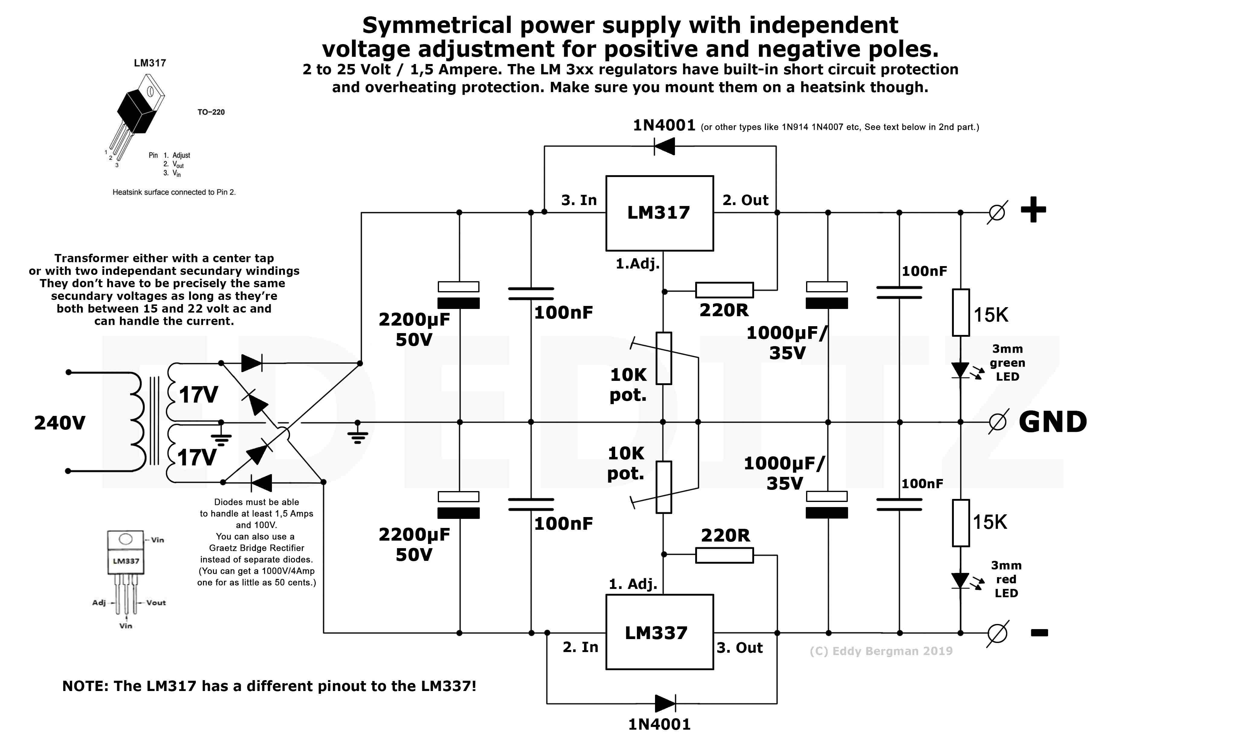 Ciao a tutti, sto costruendo il mio synth modulare e vorrei chiedervi alcuni consigli per quanto riguarda l'alimentazione vorrei realizzare una nuova PSU per il mio synth, per ora sto utilizzando un un circuito che ho realizzato con il 7812 e 7912 che puo erogarmi fino a 1 A, ma una volta completato il mio synth dovrò alimentare circa 30 moduli, e considerando che in media un modulo richiede 100mA volevo realizzare un alimentatore +-12 volt con 3/4 A come base sto partendo da un circuito classico con il lm317 e lm337 (circuito nell'immagine sotto), mi avevano consigliato questi perche i 317 e 337 non calano di tensione quando sono sotto carico pesante, e anche perche mi fa comodo poter regolare le tensioni anche su 15 volt per testare alcuni moduli particolari. per arrivare a gestire correnti cosi alte mi hanno consigliato di usare i transistr di potenza 2N3055, vorrei sentire anche il vostro parere, è buona come soluzione ? che tipo di accorgimenti dovrei seguire per aggiungere i 2N3055? dovrei implementare anche la limitazione della corrente per non rischiare di bruciare tutto? grazie a tutti per i consigli. bruciare tutto ?