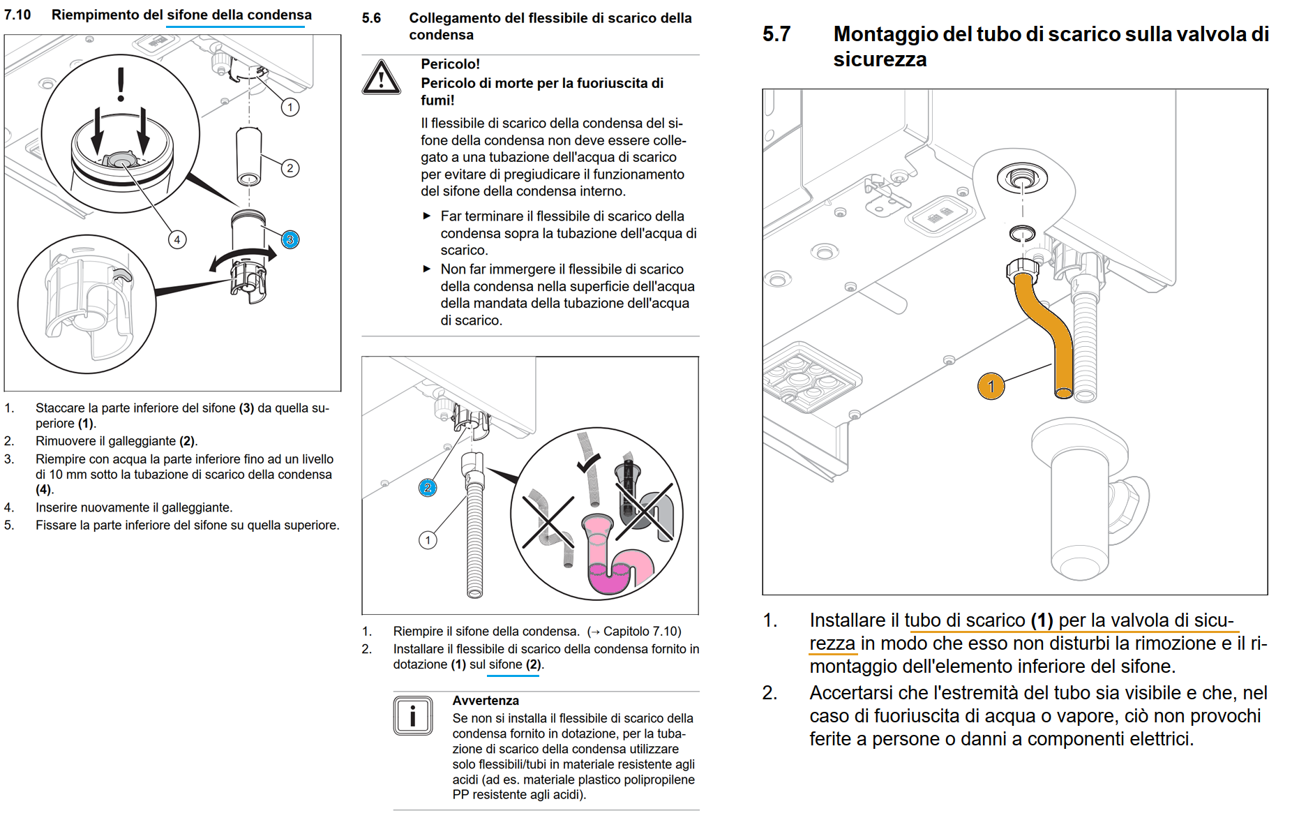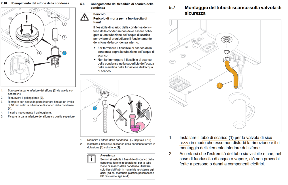 Riguardando meglio il manuale, mi sembra di capire che non ho proprio il "tubo di scarico per la valvola di sicurezza" (arancione) a cui è collegato internamente il tubo di sfiato, ma praticamente resta aperto e piscia giù... (anche il "sifone rosa" non ce l'ho, io ho collegato direttamente il tubo di scarico della condensa al "sifone azzurro" senza nessun "sifone rosa", cosa che sarebbe vietata dal manuale) incredibile però che me l'abbiano installata così e ho fatto pure 2 controlli e nessuno si sia mai accorto di niente... inoltre la perdita è così piccola che effettivamente in 5 anni di funzionamento non me ne ero mai accorto ? forse solo adesso che ho sostituito il filtro dell'acqua calda sanitaria in ingresso è aumentata leggermente la perdita... -