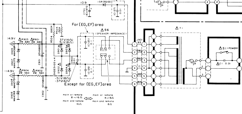 Se non si accende, dubito che tu abbia quelle tensioni di uscita. Questo è il particolare del trasformatore: Il led POWER è alimentato mediante il 10.9V (pin 1 della connessione al trasformatore). La doppia tensione è per la scelta dell'impedenza degli altoparlanti. Notare il fusibile termico montato all'interno del trasformatore (pin 1 lato dx del trasformatore). Spesso è lui che si apre spegnendo tutto. Se puoi, sconnetti i secondari del trasformatore (connettore?) e misura le tensioni a vuoto rispetto al pin 4 (comune poi a massa). Il service manual completo lo trovi qui -