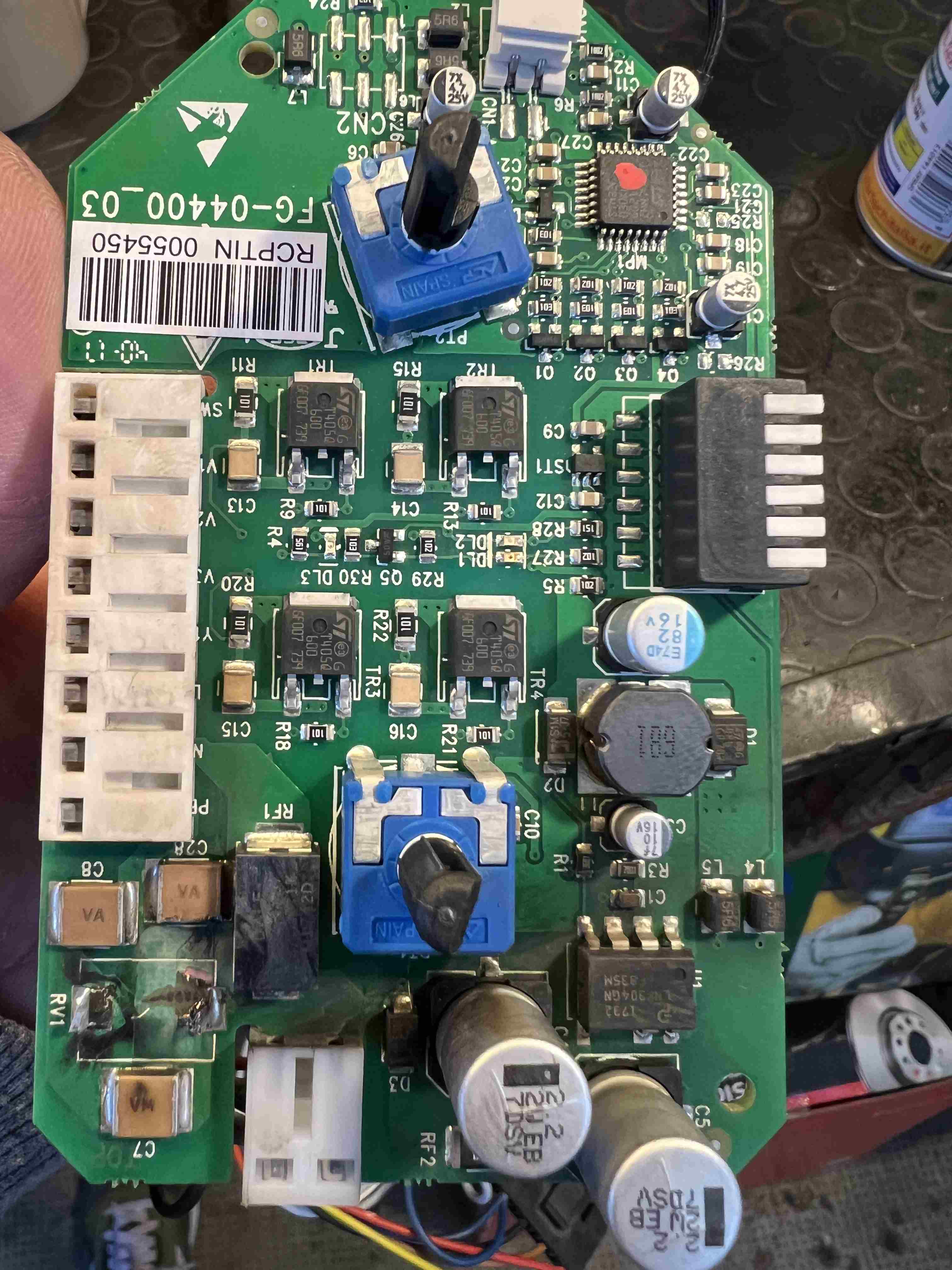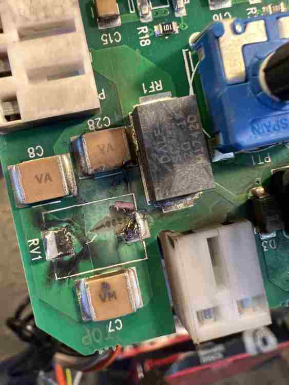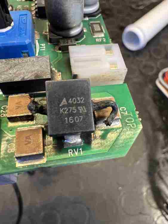 Da dove arrivano questi fancoil? Non è che qualcuno ha pasticciato con la morsettiera? Quel connettore nero da 2 a sinistra non mi sembra coerente con lo schema. Pulendo la fuliggine possiamo vedere le piste e vedere a quale ingresso della scheda il varistore è collegato. Fai foto entrambe le facce della scheda. Il varistore è un elemento di protezione da forti sbalzi di tensione e si installa in parallelo con l'ingresso. Se non si è danneggiato altro la scheda dovrebbe funzionare senza di esso ma appunto senza protezione. E' dato per 275V... hai forse collegato 2 fasi invece di fase e neutro? -