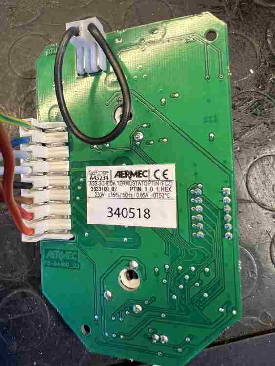 L’ho collegato ad una normalissima presa elettrica Se intendi il connettore a sinistra che ho cerchiato in giallo è la sonda della temperatura ambiente che potrei pure eliminare ma è in entrambi i fancoil Il fusibile originale è da 2A ritardato, quello che ho usato è un fusibile normale da 4A, potrebbe essere un problema? come mai non si è bruciato il fusibile invece del varistore? Posto le foto della scheda -