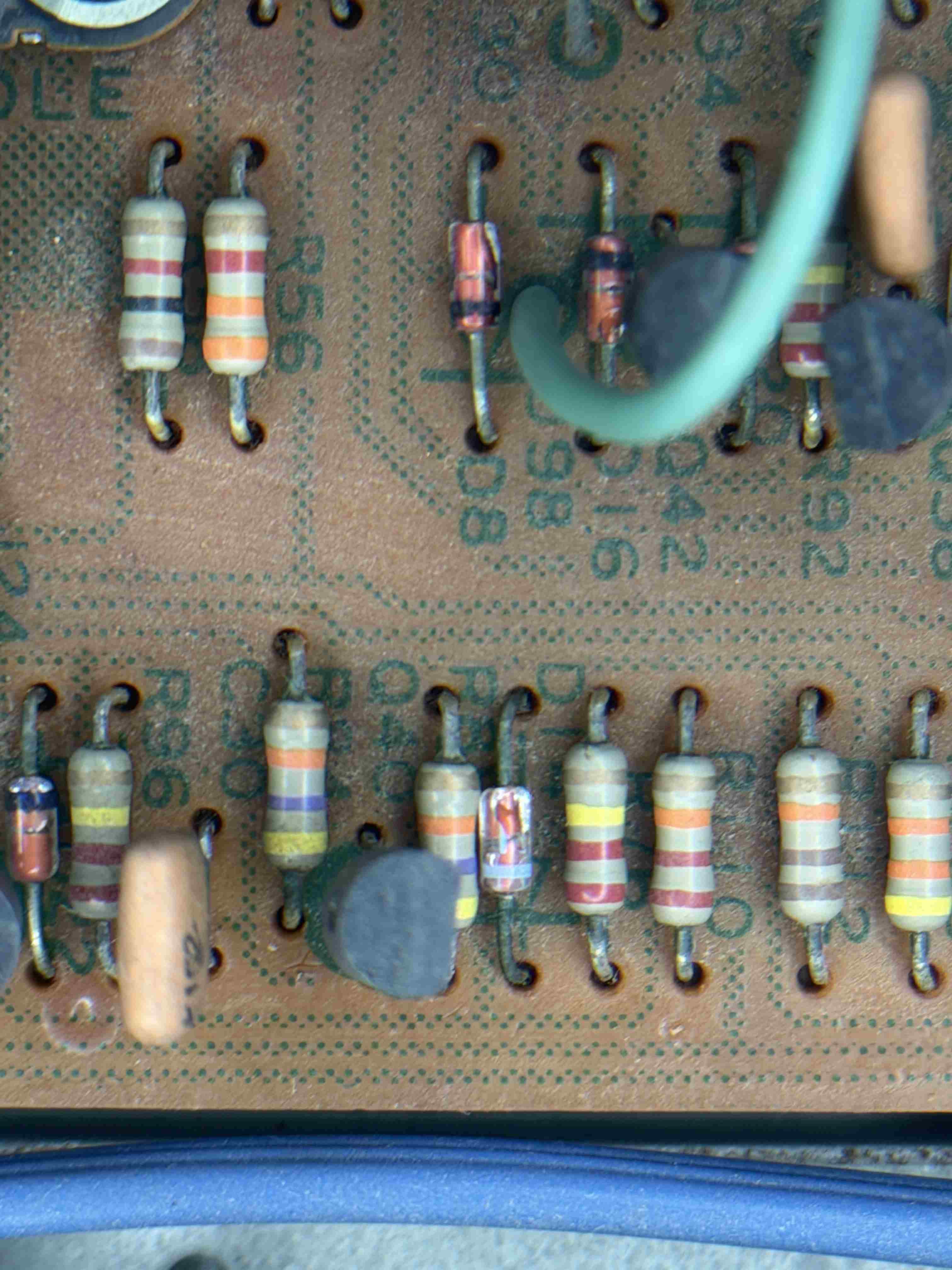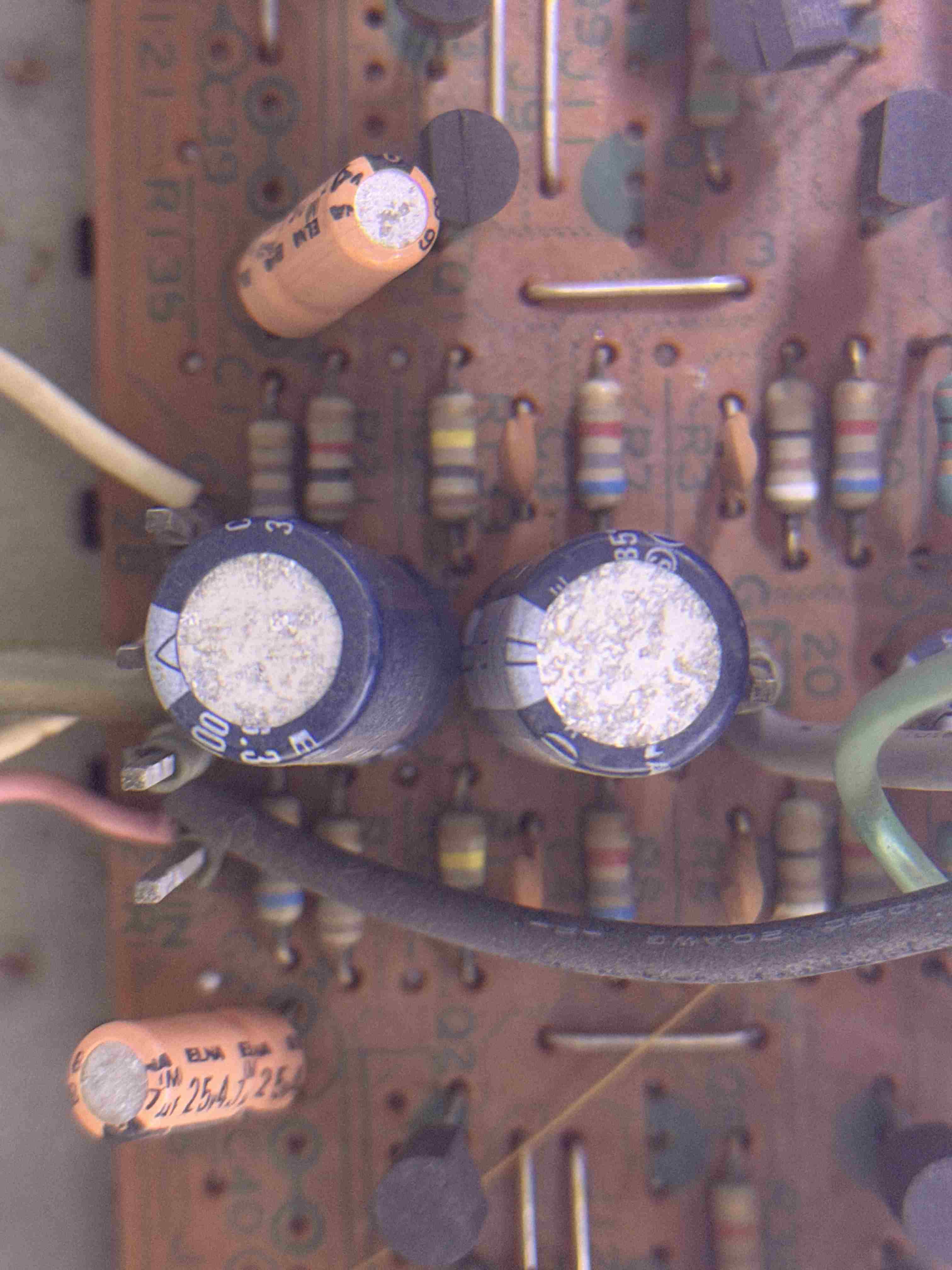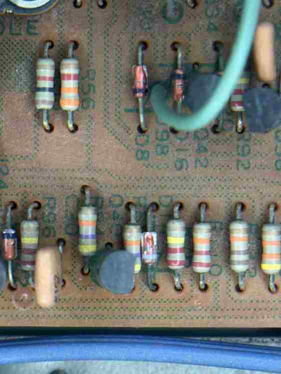 Pulendo la scheda dalla polvere per bene e osservando meglio sotto la lente di ingrandimento ho notato che una buona parte delle teste dei condensatori che sono ossidati, e ho notato alcuni diodi che hanno il rivestimento esterno spaccato quindi presumo che siano guasti quei diodi e quindi da sostituire assieme ai condensatori.... -