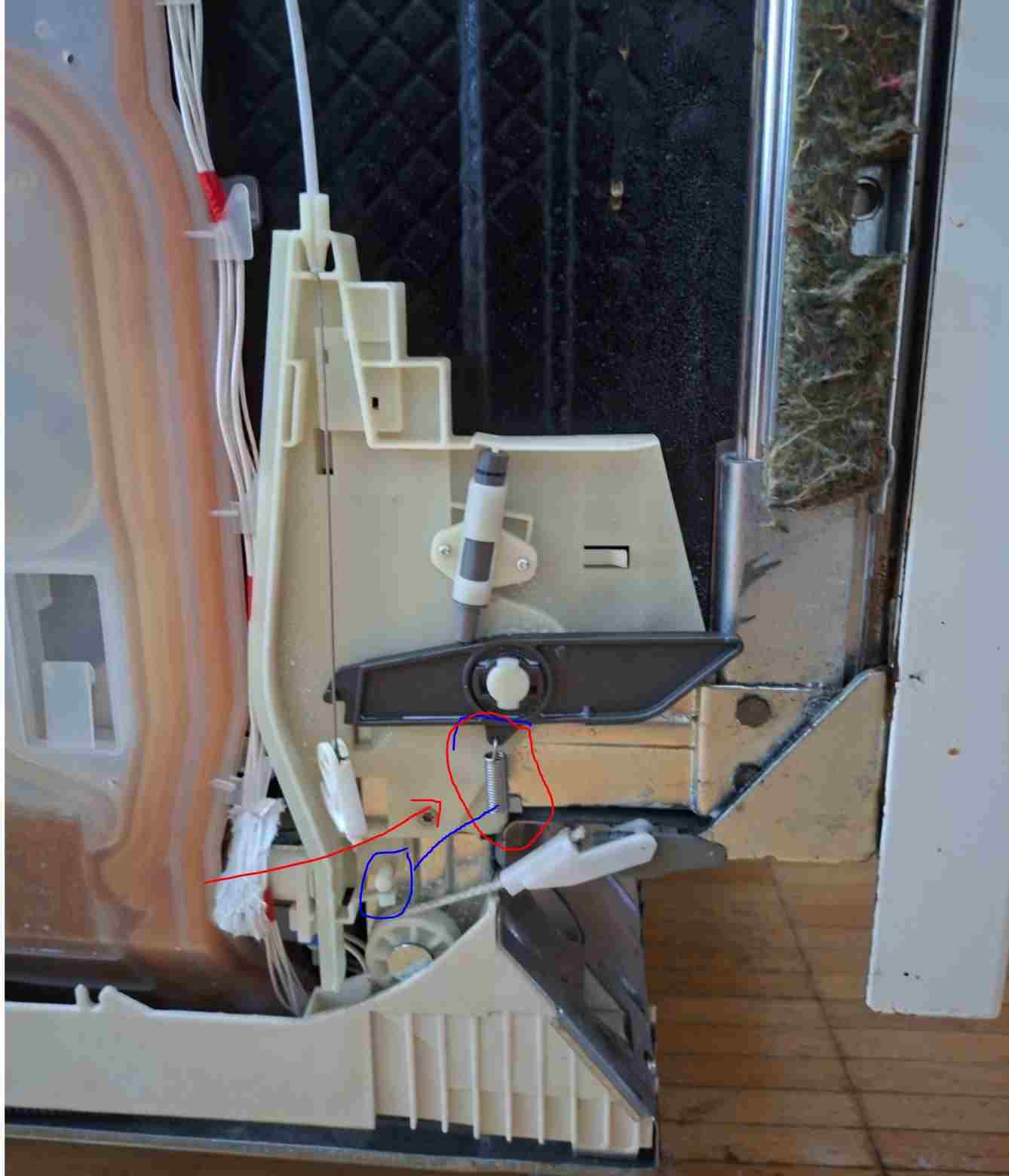 Altro problema: ho visto che si è rotta la molla in foto, dovrebbe essere collegata al punto che ho cerchiato di blu, credo che gestisca l'apertura della porta. Sapete se collegando la lavastoviglie senza questa molla, posso avere problemi? nel caso dove potrei trovare questo pezzo di ricambio? grazie per l'aiuto che mi state dando -