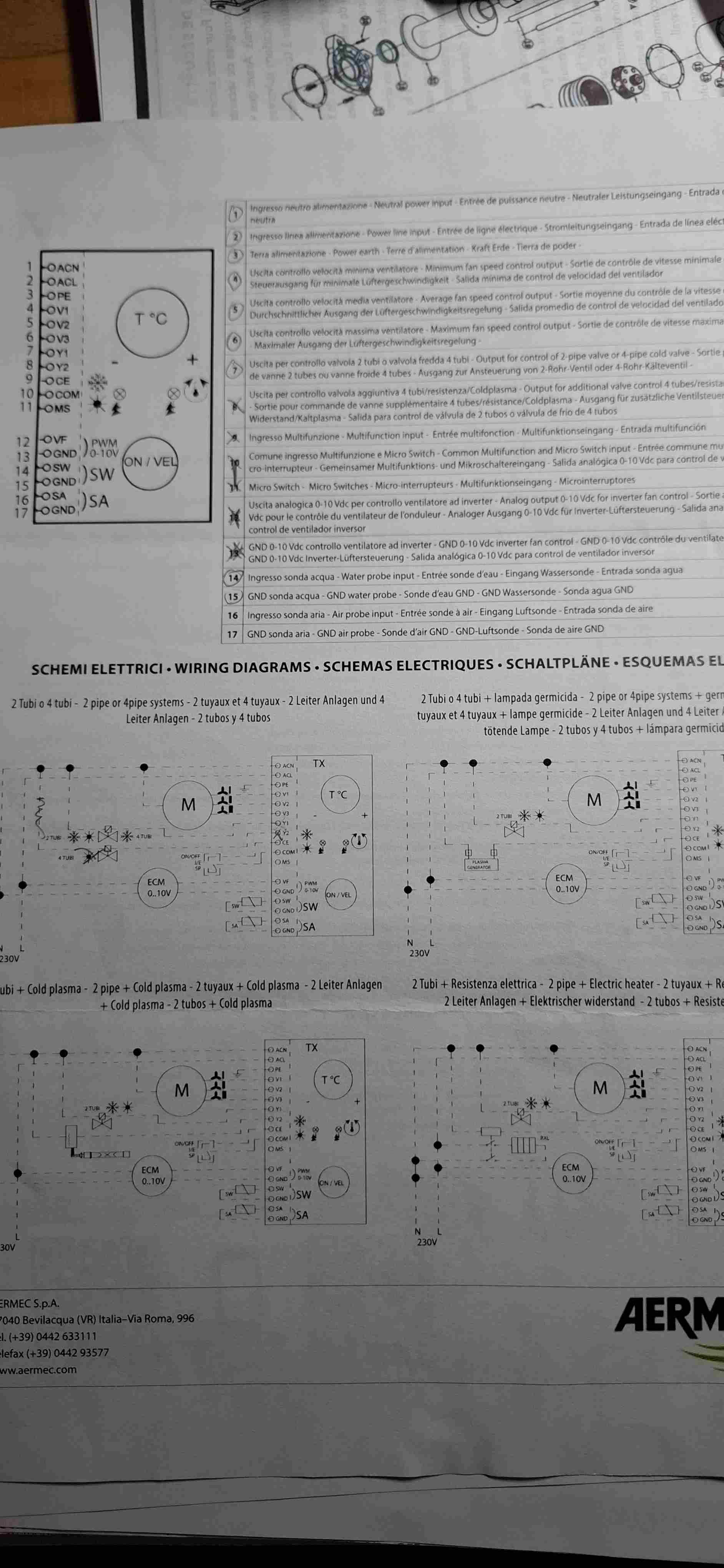 Salve a tutti. Ho acquistato il comando in oggetto per sostituire quello nativo su fan coil Aermec FCX installato a bordo tipo PXBI. Mi interessa l'installazione a muro perchè più confacente al mio utilizzo. Sono hobbista, non pratico di elettronica. Ho fatto una prova a "vuoto" del nuovo acquisto, alimentando correttamente i morsetti relativi a N-L e terra. La cosa che non capisco è perchè risultano alimentati sempre sia i tre contatti per le tre velocità e anche le uscite per controllo delle valvole, comunque sia posizionato il comando off, auto, v1, v2, v3. Allego una foto. ringrazio per l'aiuto. Renato -