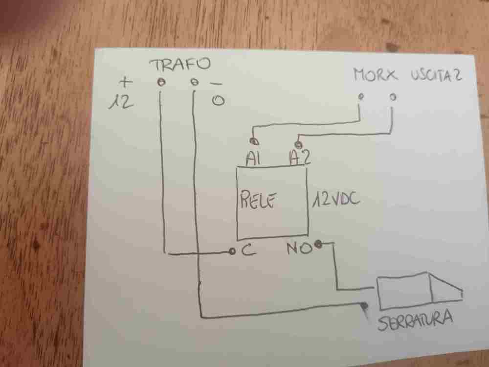 Ciao grazie per la risposta ma io non ho nessun citofono... Dovrei far aprire il cancello pedonale con un secondo codice abbinato all uscita 2 del Morx nice... Con l uscita 1 del morx ho registrato un codice sul tastierino che apre il cancello carrabile e funziona perfettamente... Ora vorrei abbinare un secondo codice solo per il cancelletto pedonale ovviamente dall uscita 2 del Morx nice. Oggi ho eseguito i collegamenti in foto poi ho fatto la registrazione dell uscita 2 del Morx nice ma non apre la serratura.... Vorrei capire se sbaglio qualche collegamento o qualche procedura di programmaxuone del Morx.... Ho alimentato tutto con trafo separato