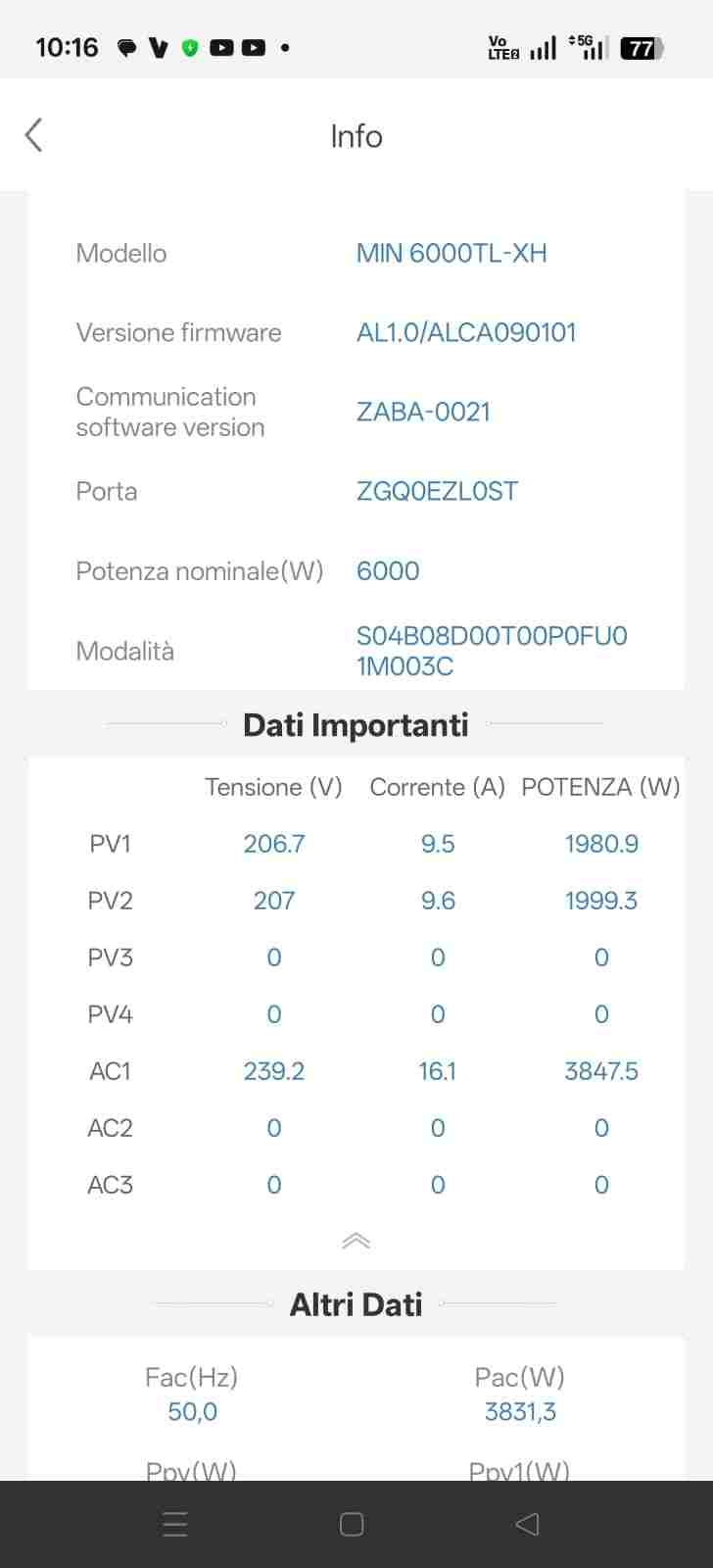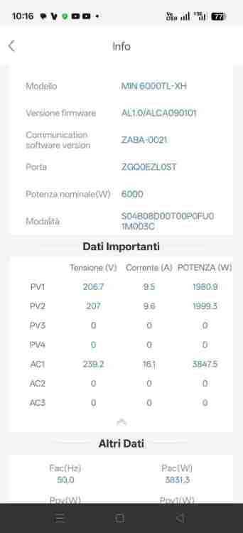 Dai valori estratti dall'app ShinePhone credo che il tecnico abbia creato 2 stringhe da 7 pannelli ciascuna. Sul lastrico solare figurano 2 fila di pannelli, una da 8 e l'altra da 6. Praticamente la fila da 8 sta prestando un pannello per avere due stringhe da 7. Questi sono i dati estratti da ShinePhone alle 10:16 di oggi. (bella giornata di sole) Le tensioni e le produzioni delle 2 stringhe sono troppo simili (differenza meno dell'1 percento) per pensare ad un 8+6 Gemini Ai mi dice: Avendo due stringhe bilanciate, l'inverter distribuisce il carico termico su entrambi i suoi ingressi (MPPT), scaldandosi meno e durando di più nel tempo. Con 7 e 7, ogni MPPT riceve circa 14.6A - 16A. Poiché l'inverter accetta fino a 16A per ingresso, stai spremendo ogni singolo Watt che la parte posteriore dei pannelli produce grazie al riflesso del bianco. Spero sia vero, in ogni caso l'impianto produce molto bene. Nei giorni scorsi ho avuto produzioni giornaliere attorno ai 40 / 42 Kwh per cui escluderei errori di stringhe. -
