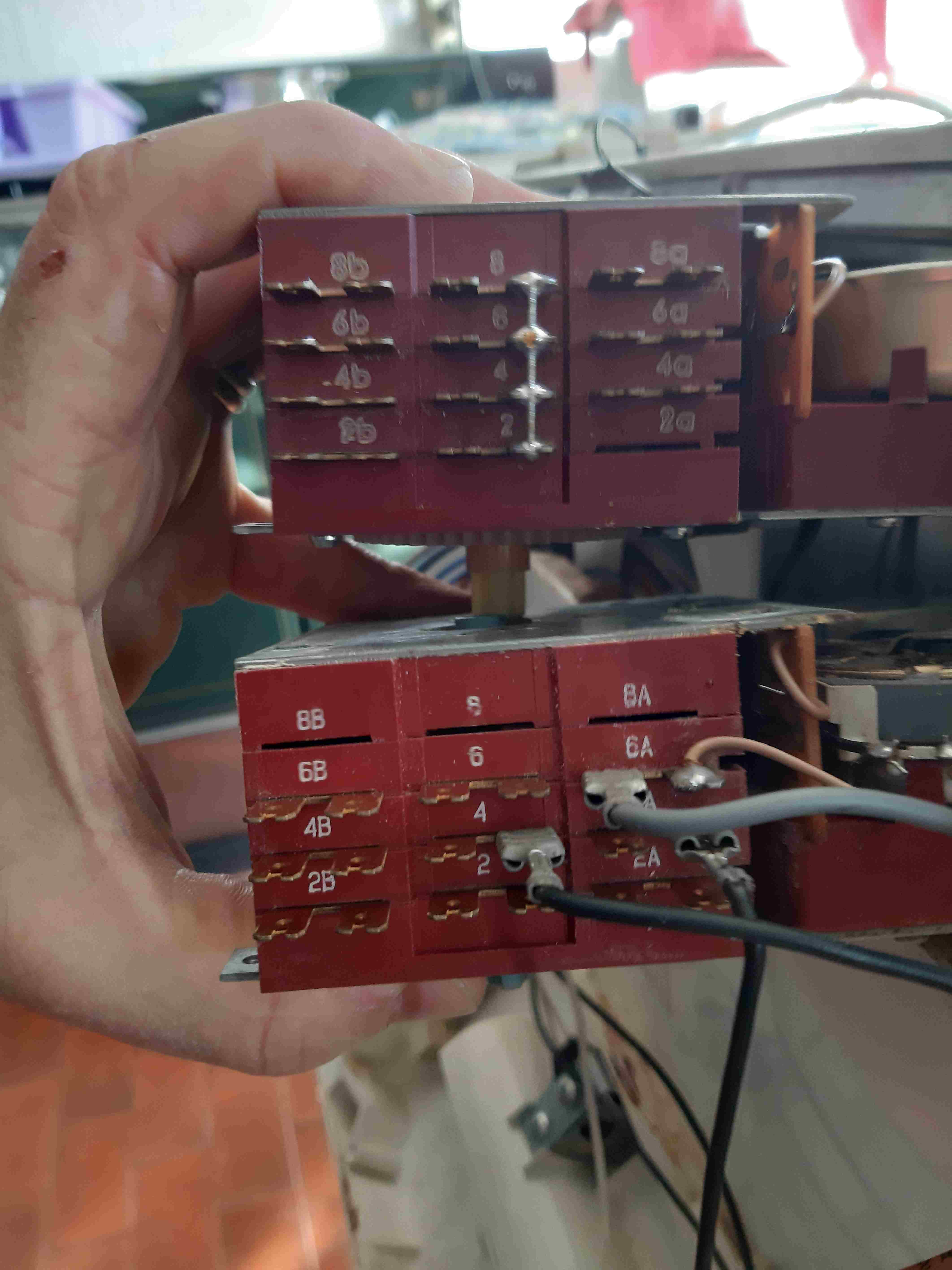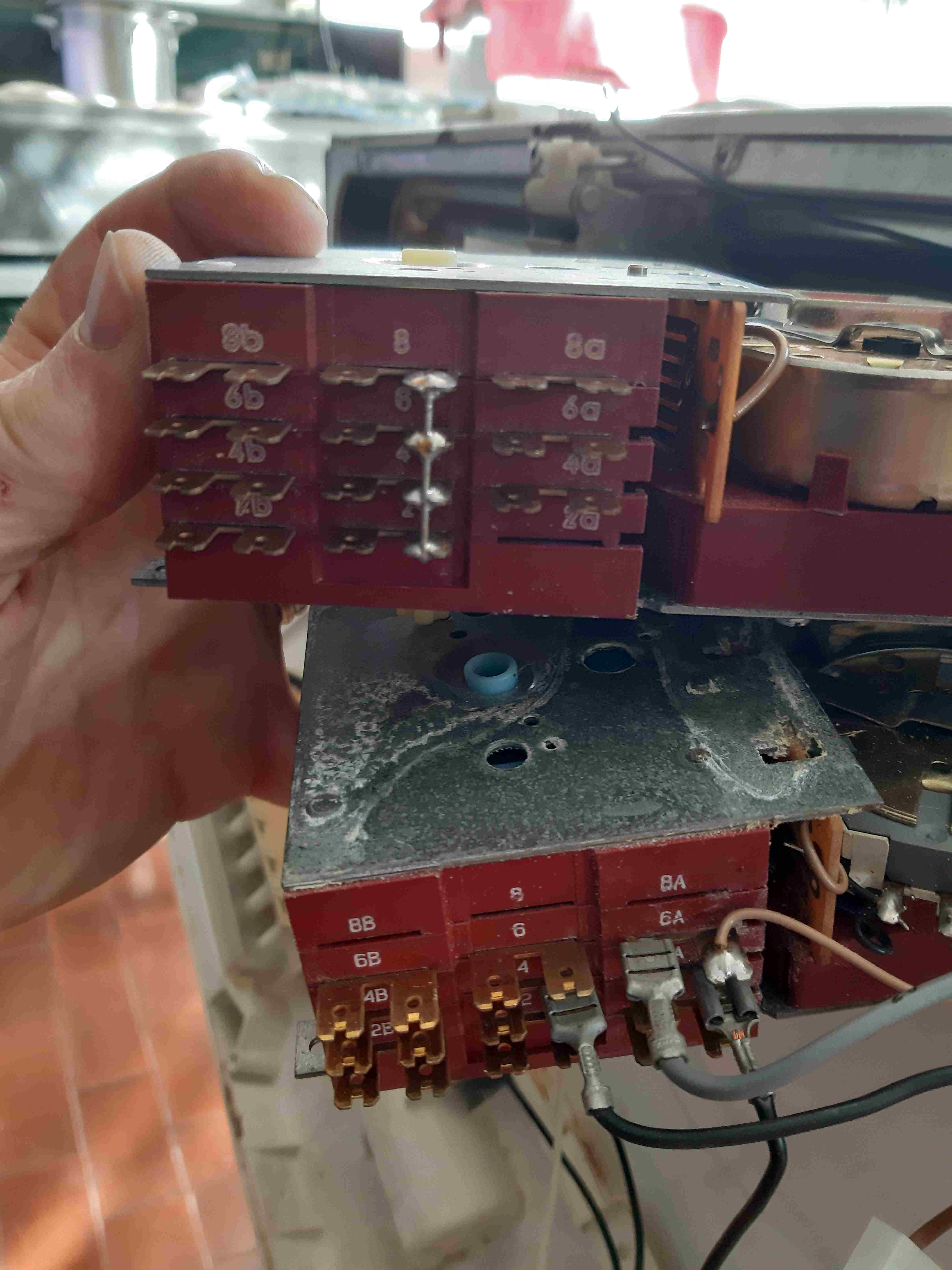 La lavastoviglie da incasso REX IP560, quindi datata ma robusta, si è bloccata durante un lavaggio con la sola spia di alimentazione accesa. Ho diagnosticato il guasto sul timer fissato dentro la portiera poichè smuovendo i rotori è ripartita ma il pezzo mi sembrava parecchio ossidato. Avevo un pezzo di ricambio compatibile e cioè il timer AKO type 11800 D125/1 ma qui sono iniziati i guai poichè quello montato ha alcuni contatti mancanti e quello nuovo ha dei contatti saldati in origine ponticellati (vedi foto allegate). Sto cercando disperatamente uno schema di cablaggio dei contatti del timer per poter riparare questa lavastoviglie (che mia zia di 84 anni non vuol a nessun costo sostituire)... Qualche esperto di questo bel forum ha conservato qualche perla cartacea o in pdf da service ?? Grazie !!! -