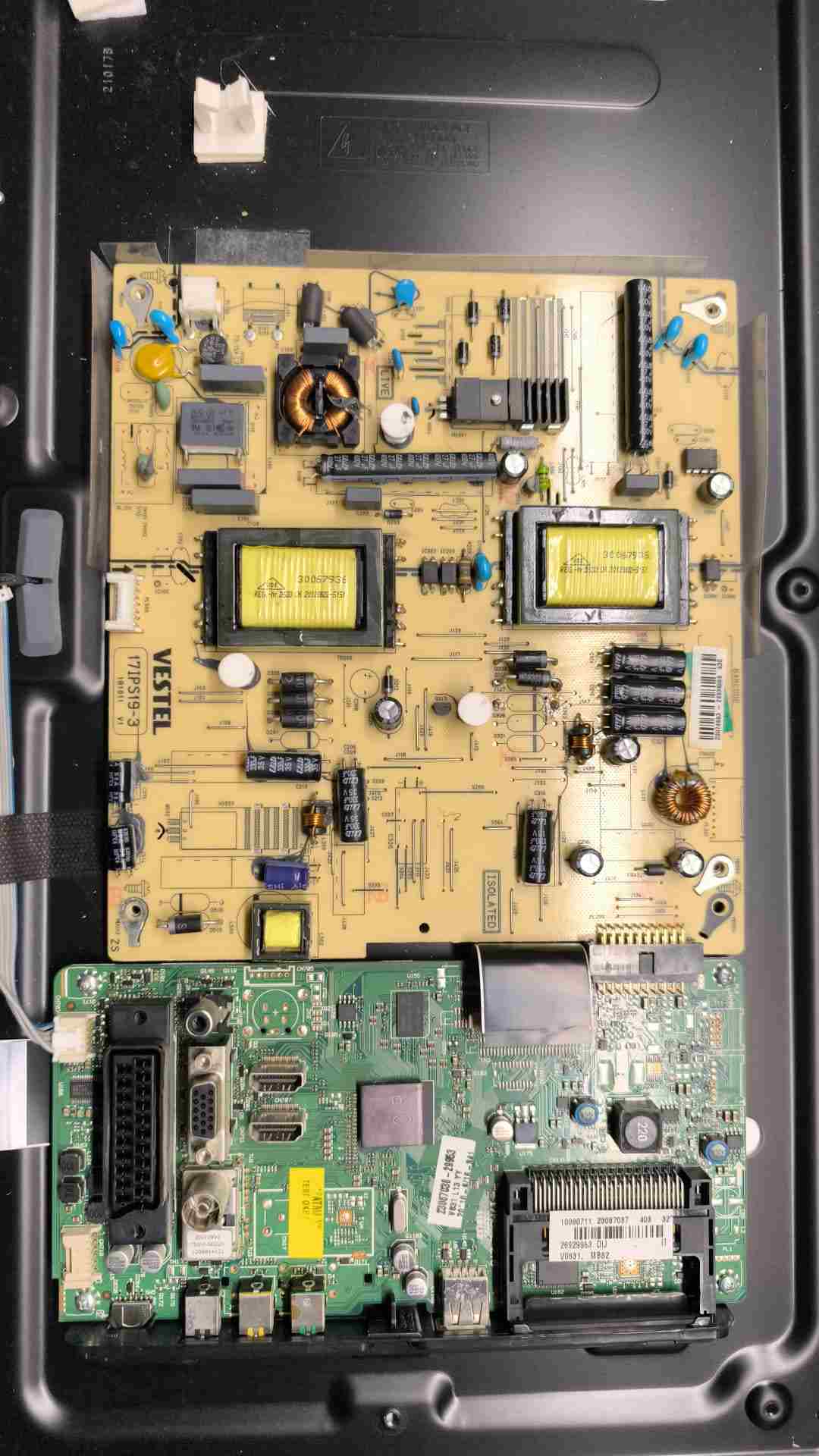 Buona sera. Posseggo un televisore philips 32pfl2807h/12. La scheda di alimentazione è una Vestel 17IPS19-3 (23067038-29953). Ho cambiato la scheda in questione perché aveva un dei diodi in uscita sulla linea led in corto e per non rischiare l'ho messa nuova. La tv mostrava il led di accensione ma una volta pigiato il tasto cominciava a lampeggiare per 7 volte poi faceva un lampo sui led e si spegneva tutto. Ho cambiato anche le barre led, che sono nuove. Anche in questo caso la tv fa lo stesso difetto. Ho misurato le tensioni. Quando la Tv viene accesa ci sono 12 volts della mb e i 25 dei led, ma poi va in blocco facendo un lampo sui led. Se tolgo il connettore dei led la tv parte, facendo i 7 lampeggi sul led di stato e si mantiene accesa sulla parte logica, cosa che ho verificato inserendo una chiavetta sull'usb che risulta alimentata. Sul connettore delle barre led ci sono un positivo e due negativi a 60 volts a destra e un positivo e due negativi a 60 volts a destra. Le barre non sono in corto. Ho misurato un led alla volta e si accendono tutti. Praticamente senza attaccare il connettore barre led la tv sembra rimanere accesa. Verificata con la termocamera la mb non da strane temperature se non sul chip principale che si mantiene comunque fresco. Cosa posso verificare ? Grazie