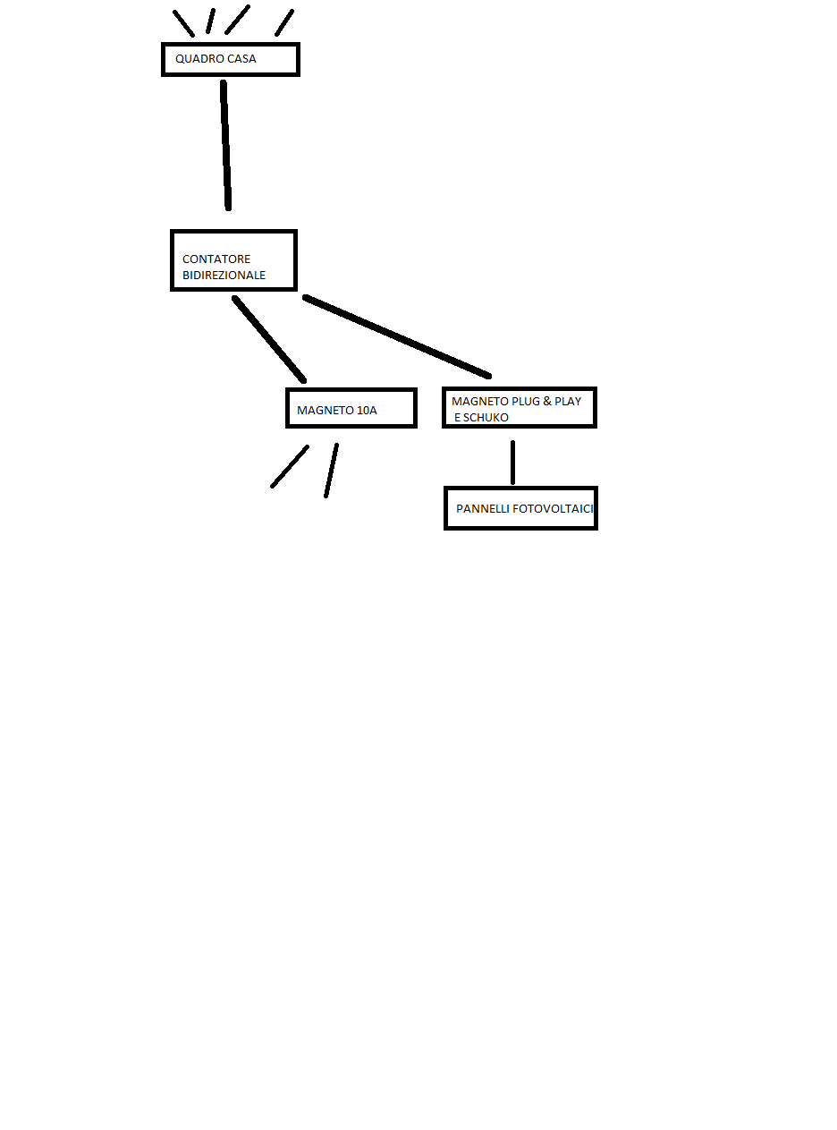 buongiorno avrei bisogno di delucidazioni per valutare l'installazione di plug and play fotovoltaico. mia situazione attuale la allego in foto voglio mettere 2 pannelli da 400w plug and play per stare sotto gli 800w che sono imposti per questo sistema i miei dubbi sono: 1) la distanza tra magnetotermico (che se potete mi dite quale mettere) e la shuko dedicata ai pannelli e i pannelli stessi sono circa 15 metri (all'aperto li metterò su una tettoia) quindi .... 2,5mmq in apposita canalina? oppure meglio mettere la schuko vicino a inverter sotto pannelli e poi i 15 metri di 2,5mmq andranno al magnetotermico? 2) microinverter è giusto prenderlo invece che da 800w un po' più potente e poi in ogni caso raffreddarlo con una ventola? 3) ho visto che bisogna fare la segnalazione al gestore e inviare documenti. trattasi di schema elettrico totale di tutto l'appartamento o unifilare della semplice linea del fotovoltaico? perchè ho tutto a norma recente ma non ho documentazione. e poi la conformità del produttore (è del sistema pannelli+microinverter che compro)? grazie