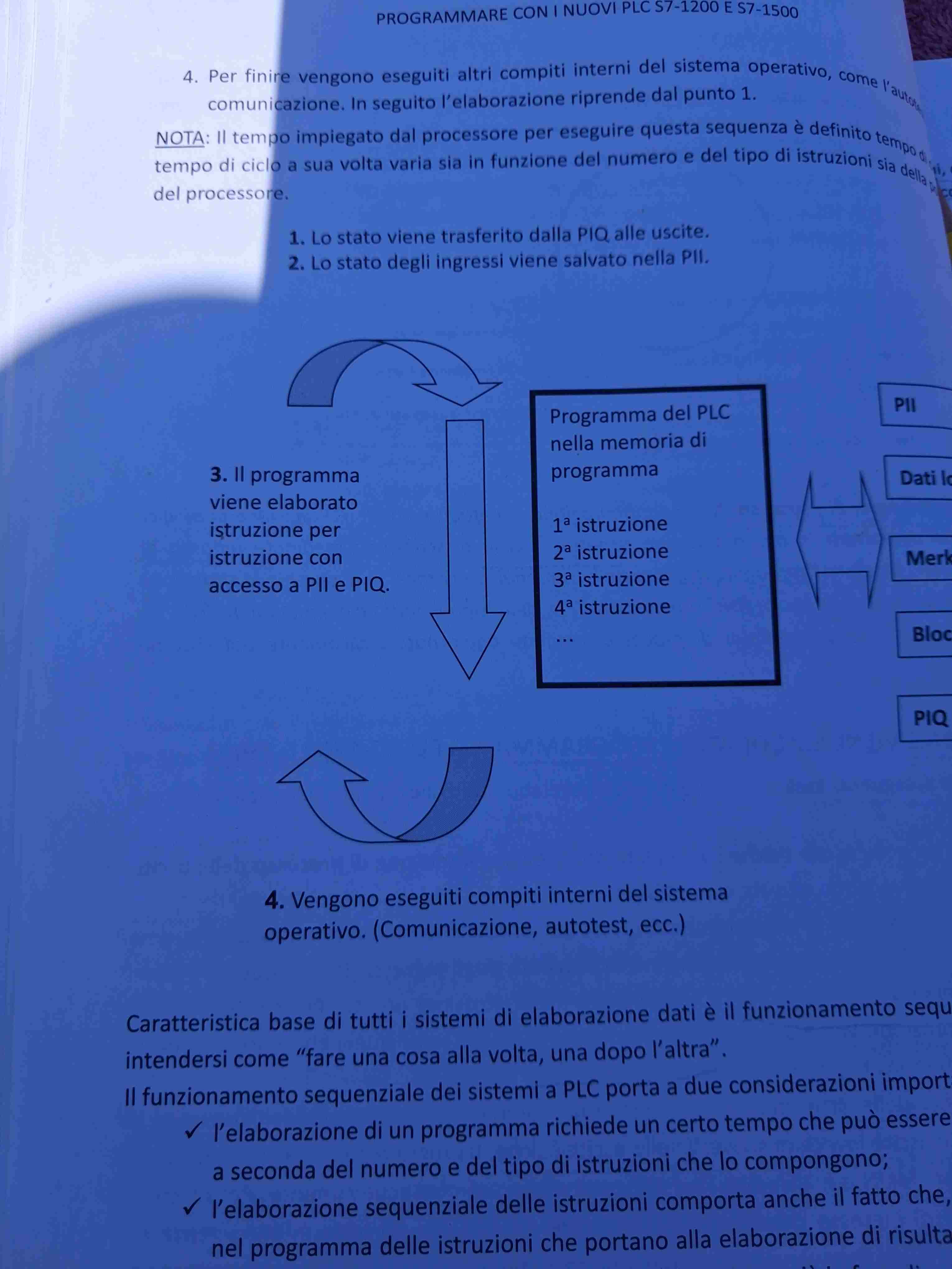 Buongiorno sto leggendo un libro didattico s7. A quanto vedo nel immagine tutte le informazioni che viaggiano per cavo dati verranno elaborate nel terzo ciclo, è corretto? Se ad esempio un hmi mi attiva un out nel ladder, al primo ciclo non sara attiva, ma rilevata, al secondo nemmeno perchè gli rlo vengono decisi al punto 3. Al terzo l uscita sarà attivata?