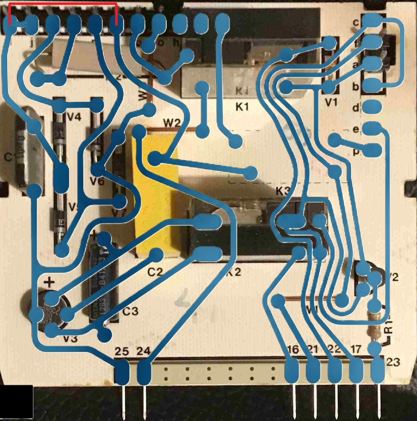 Misure fatte tra e1 e - resistenza di circa 500 ohm ( mi sembra che è un filo diverso dovrebbe andare a qualche sonda dimmi se sbaglio) tra g e i mi da continuità Come me la da tra 24 e i eccitando il rele’ k1 X procedo con la scheda sotto tensione? -