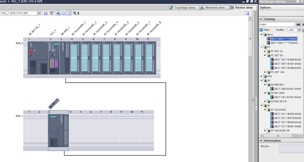 per prima cosa componi il tuo rack 0 con cpu, im360 e gli altri moduli di I/O poi dalla sezione rack del catalogo aggiungi un nuovo rack e ci metti la im361. Il collegamento tra le due im compare in automatico. -