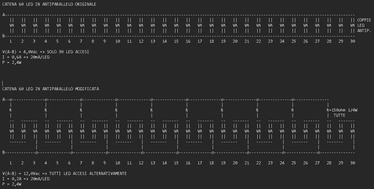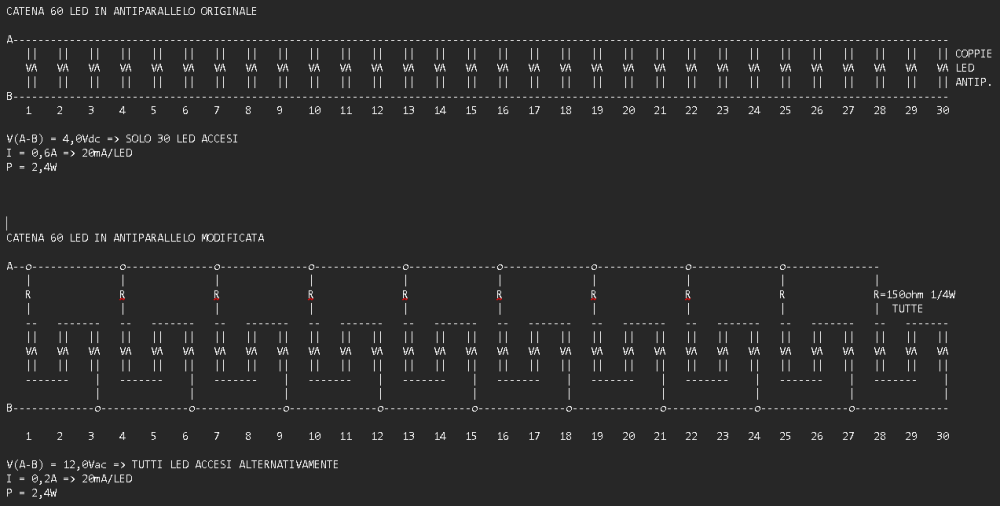 Ecco lo schema che pensavo e che potresti alimentarlo con il trasformatore che hai, una volta aperto e prendendo la sola uscita da 12Vac. Chiedo venia per la bruttezza ma l'ho fatto con un semplice editor di testo 😁 Se hai dubbi chiedi pure, ma questa è un'opzione possibile usando quello che hai e aggiungendo solo 10 resistenze da 150ohm 1/4W. Certo richiede un po' di lavorio.