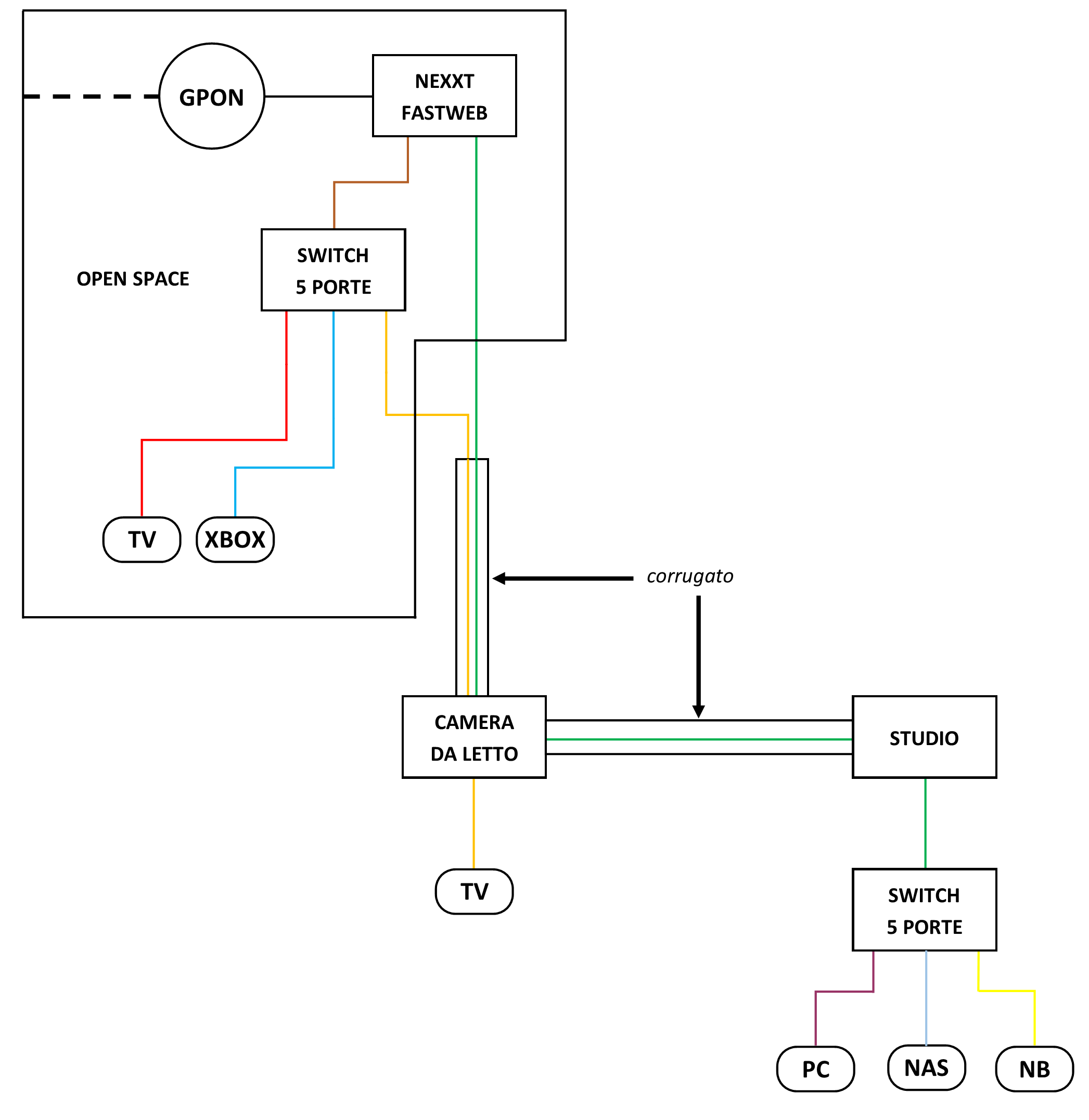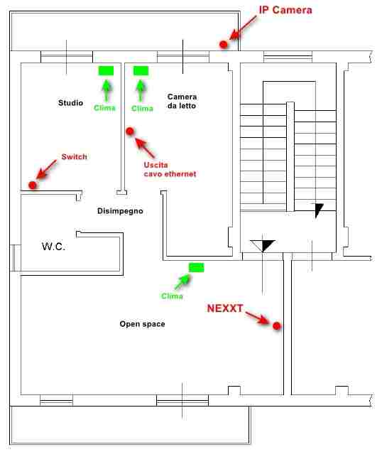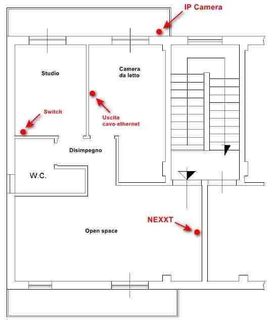 Buongiorno! Grazie a tutti per le risposte! Scusatemi se vi rispondo solo ora, ma non ho ricevuto notifiche malgrado l'opzione sia attiva. Ad ogni modo, come scrivevo nel primo post, ho la necessità di estendere la portata del Wi-Fi (un NEXXT di Fastweb su fibra ottica) essenzialmente per raggiungere una IP Camera FHD che si trova fuori al balcone, in alto. Attualmente lo schema della rete è il seguente e questa è la planimetria di casa. Non ha muri maestri, solo pilastri e pareti con tavelle Come vedete le terminazioni dei cavi ethernet sono in camera da letto e nello studio (ora è l'attuale cameretta di mia figlia) che non vogliono access point WiFi soprattutto per paura delle onde radio. Ed è per questo che stavo valutando un extender da mettere nel disimpegno, a metà strada tra il NEXXT e la IP Camera. Ne approfitterei per collegarci anche altri dispositivi che sono piuttosto lontani: 4 Shelly per le luci e due climatizzatori (a casa ho una "buona" domotica"😁) Sono tutti dispositivi che funzionano a 2,4 GHz. Ai 5 GHz si collegano solo il cellulare mio e di mia moglie e saltuariamente un tablet. Avevo pensato a questo Archer Air E5 | Range Extender Wi-Fi 6 Dual-Band AX3000 - Serie Air | TP-Link Italia Spero che ora sia tutto più chiaro. Grazie a tutti ancora una volta! Massimo